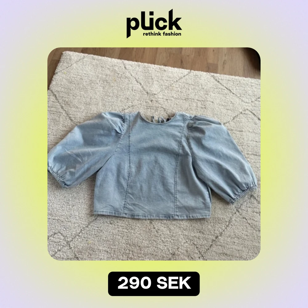 Säljer denna jeanstopp/blus med puff ärmar och knytning i ryggen😍 Använd ett fåtal gånger, fint skick!
