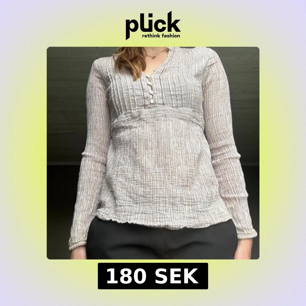 Superfin blus från Lindex i ljusbeige och vit med tunna ränder. Blusen har v-ringning, små knappar framtill och snörning i ryggen för snygg passform. Långärmad och tillverkad i ett mjukt, strukturerat bomullstyg. Perfekt för en chill och stilren look. En trasig knapp högst upp😊passar mig som brukar ha S