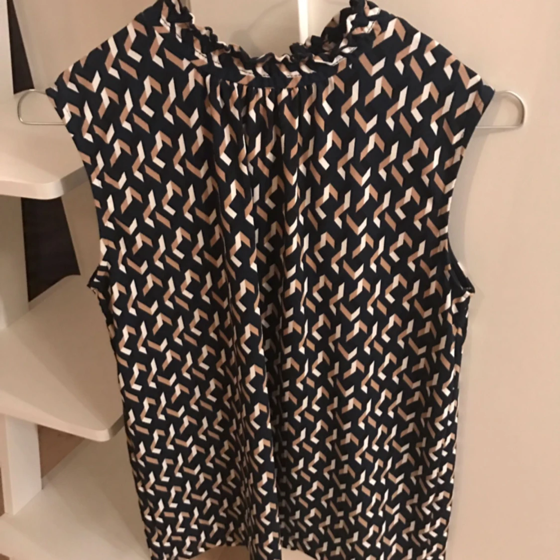 STOCKHOLM blus från MQ, XS i mycket fint skick. Marinblå, svart, vit, beige -mönstrad med hög hals och volang (se bild), ärmlös, elastiskt skönt tyg, knapp bak och liten öppning i nacken