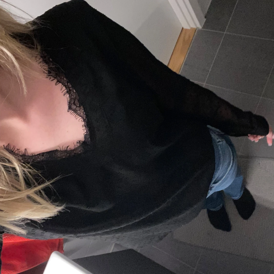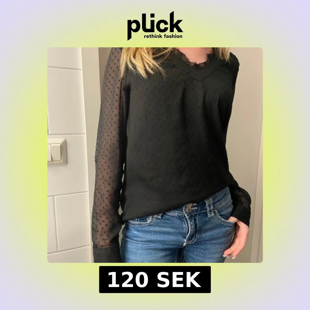 Snygg svart blus med transparenta prickiga ärmar och spetskant vid halsringningen. Perfekt för en stilren look. Pris kan diskuteras💖