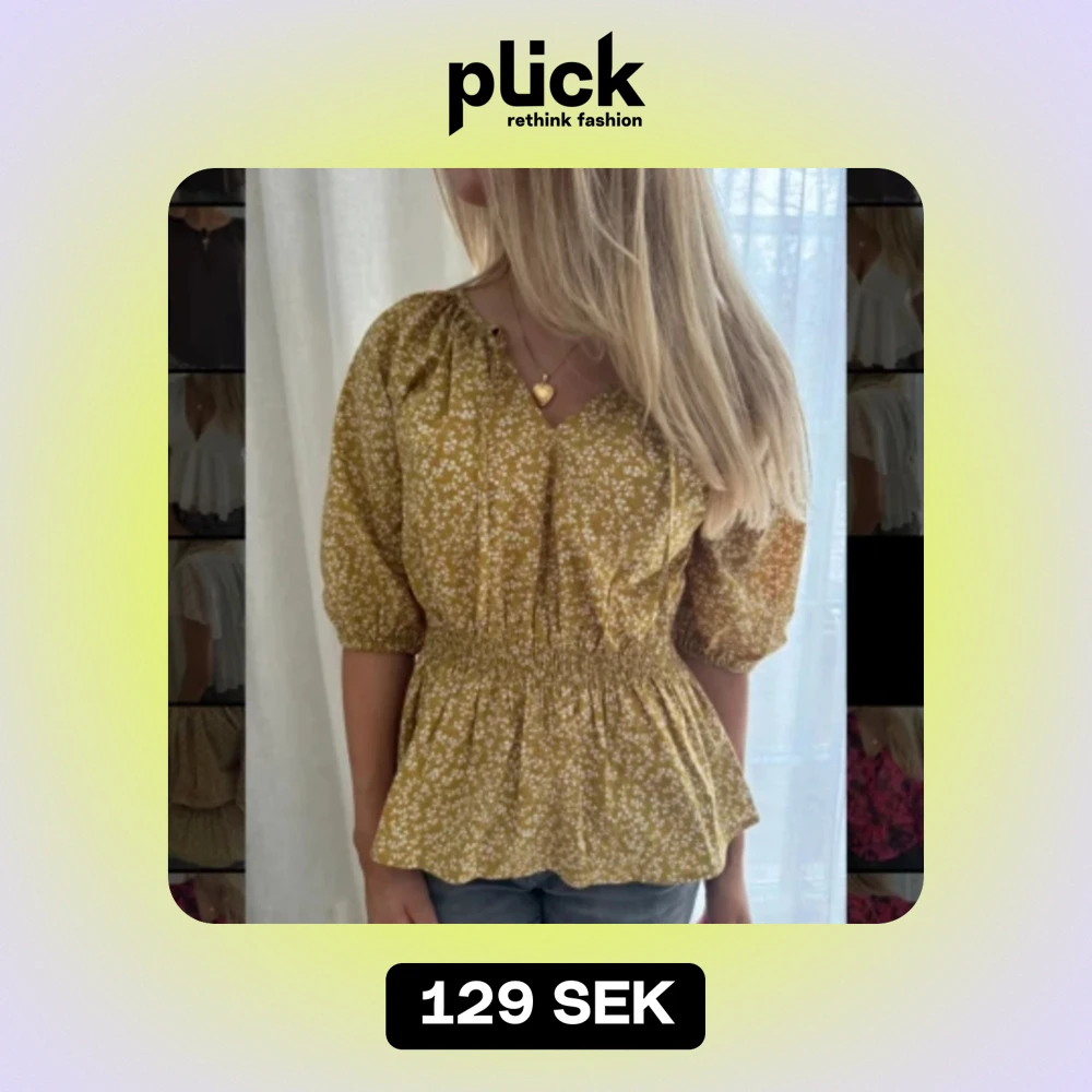 Väldigt fin blus som är gul med vita blommor. Smock i midjan. Ny. Ord pris 399kr, mitt pris 129kr