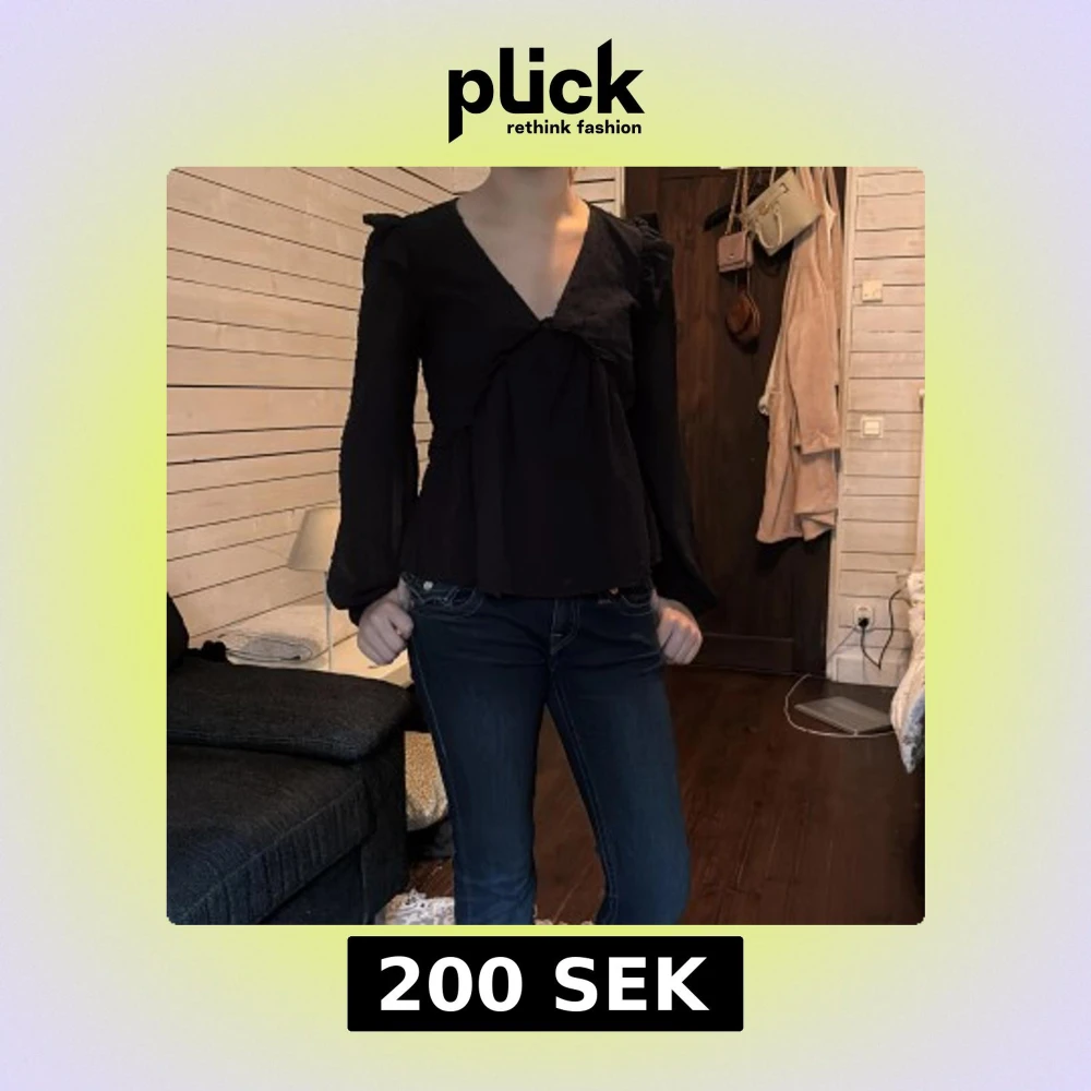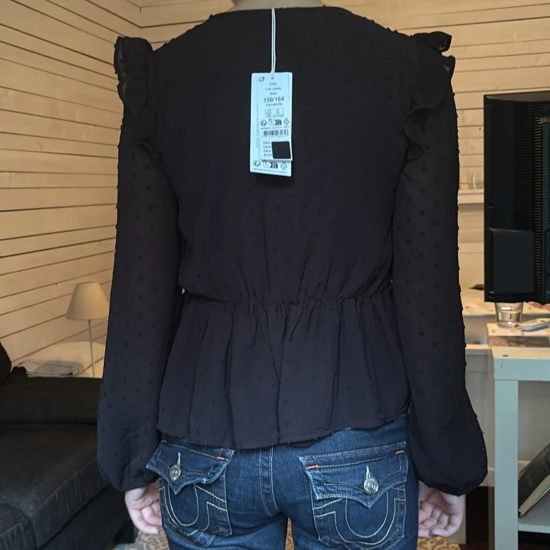 Supersnygg svart blus från Gina tricot/ y-hill med v-ringning, volangdetaljer och prickig struktur i tyget. Långa ärmar med lätt puff vid axlarna. Helt ny, aldrig använd. Säljer den då den inte är min stil längre, lite liten också💕