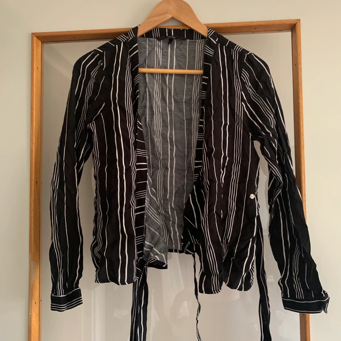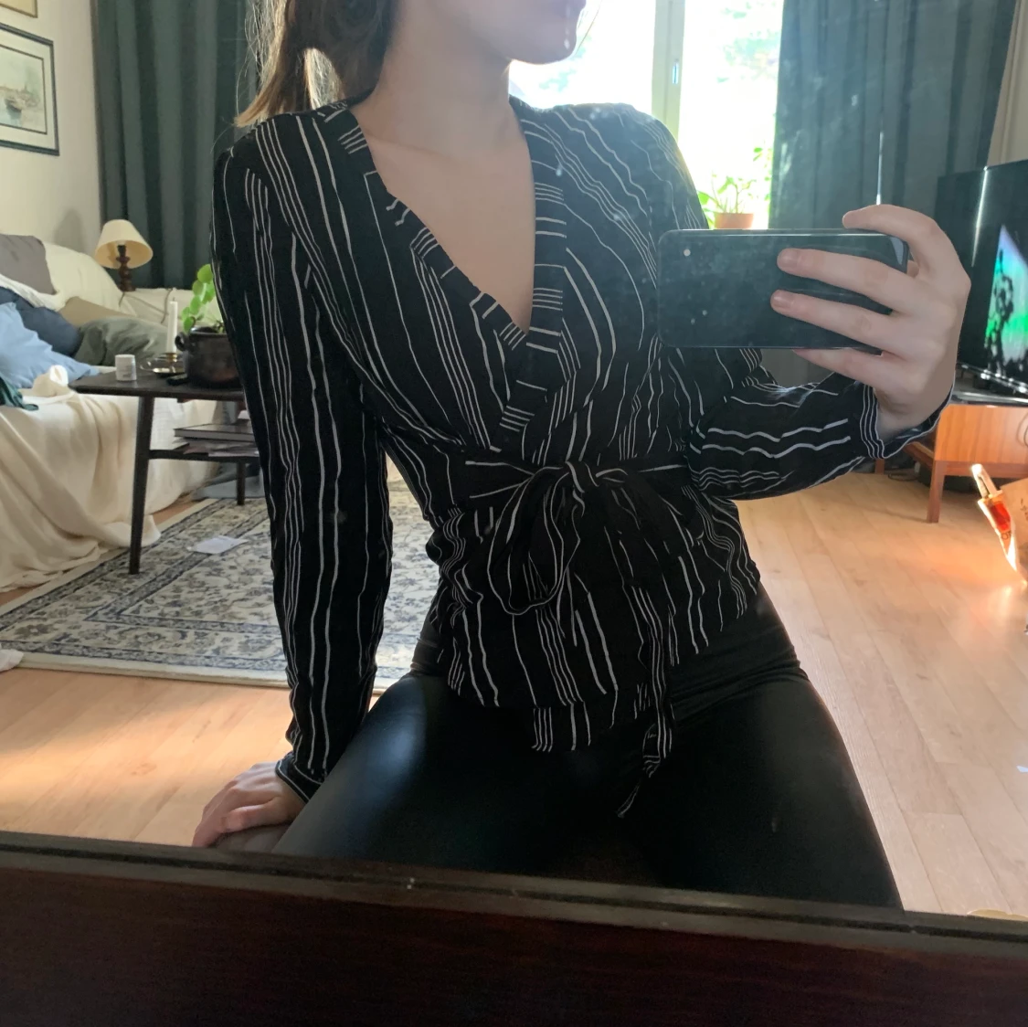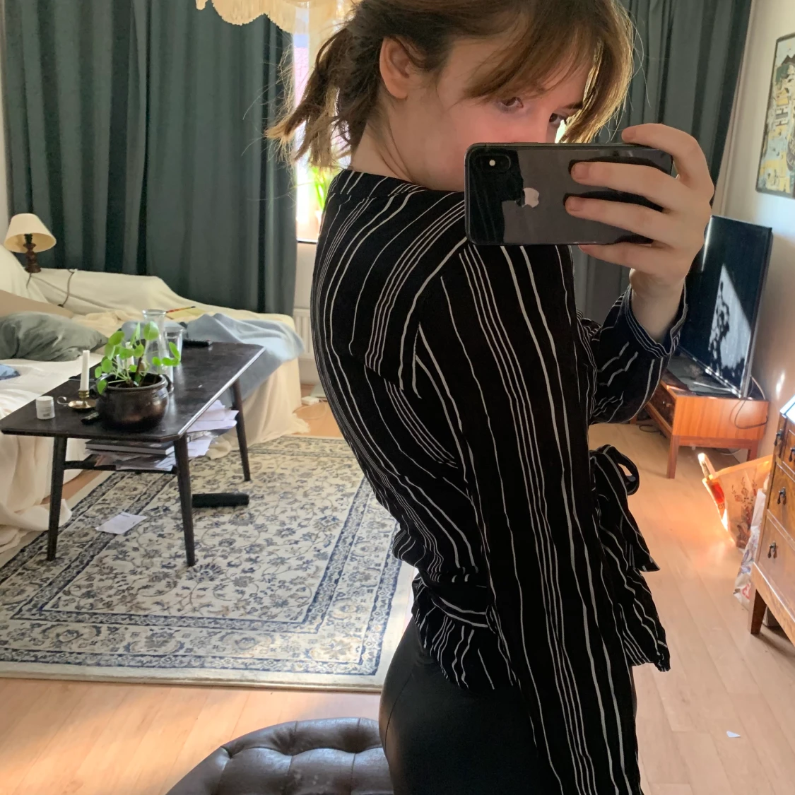 Randig blus med omlottknytning. Både knapp, litet snöre och stort band för att hålla ihop den. Blankt material ❤️