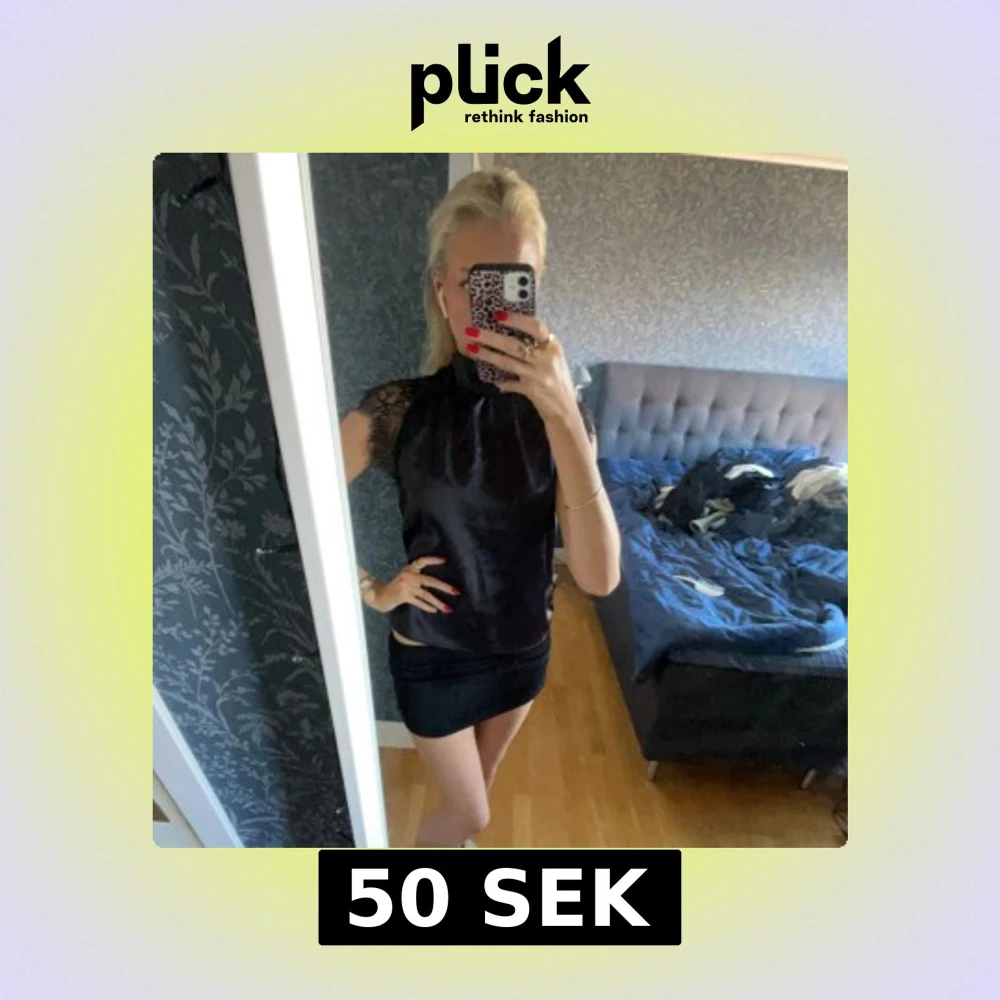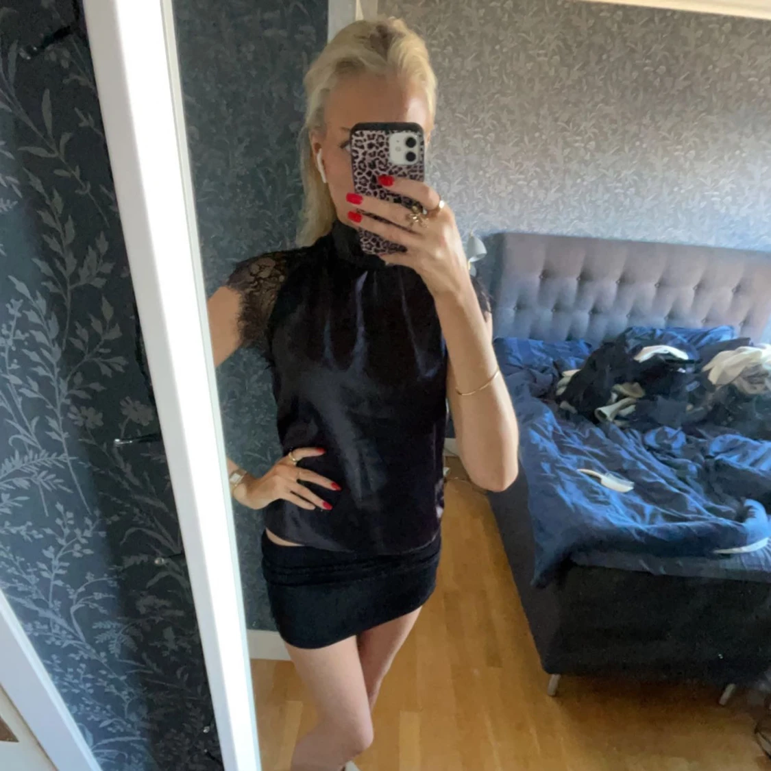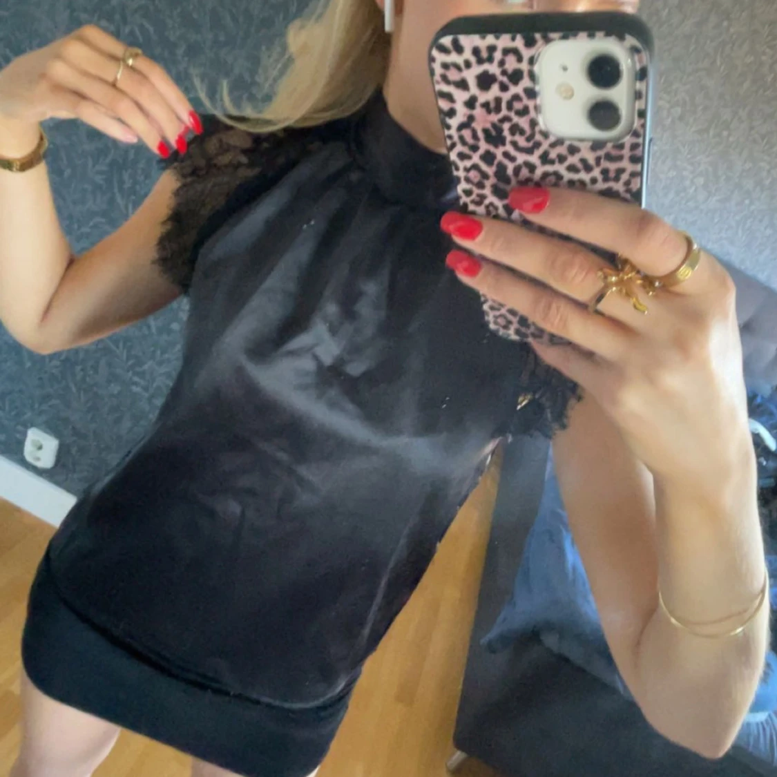Snygg svart ärmlös blus med spetsdetaljer på axlarna. Perfekt för en kväll ute eller en speciell tillställning. Den har en elegant och stilren design.