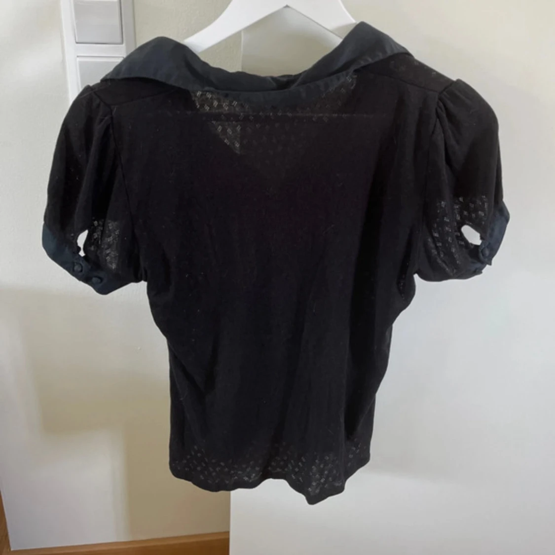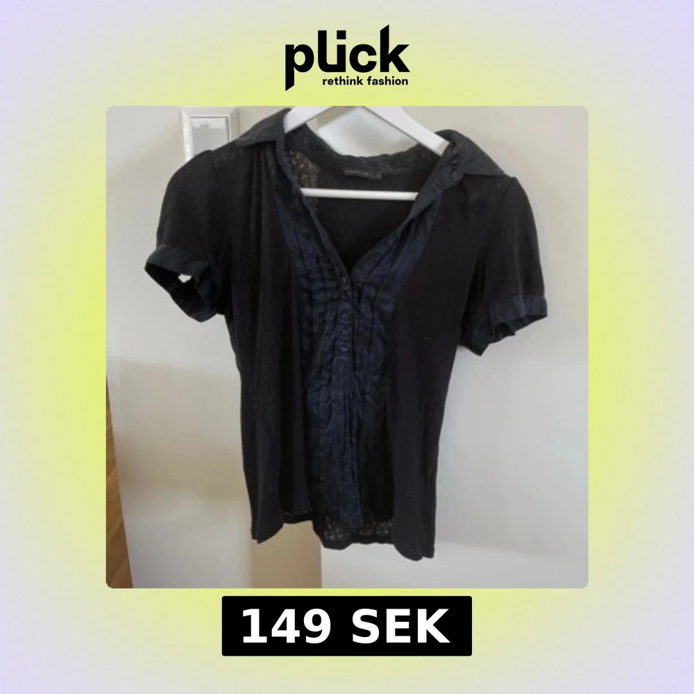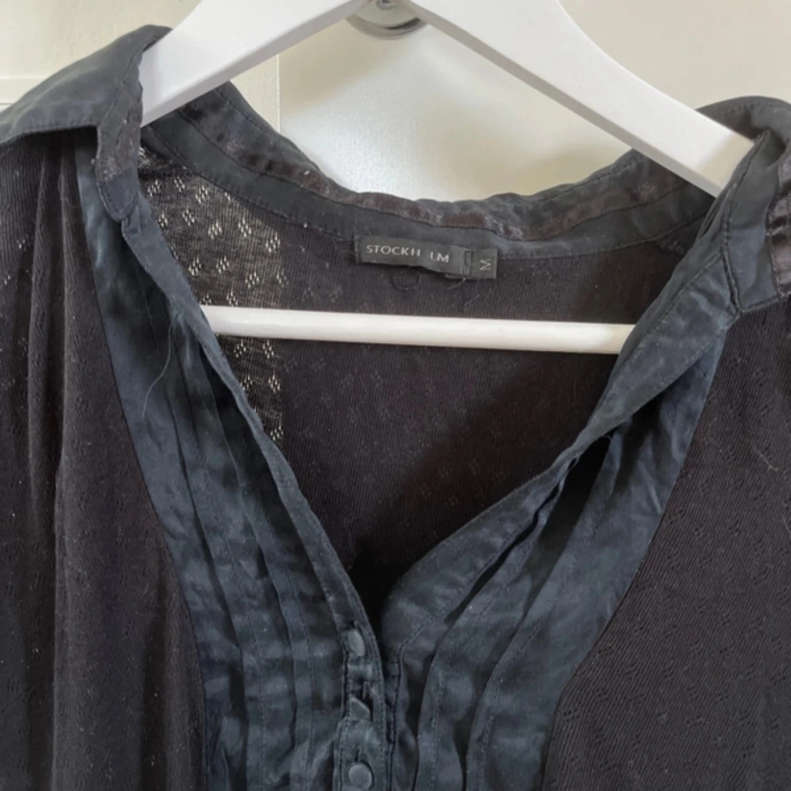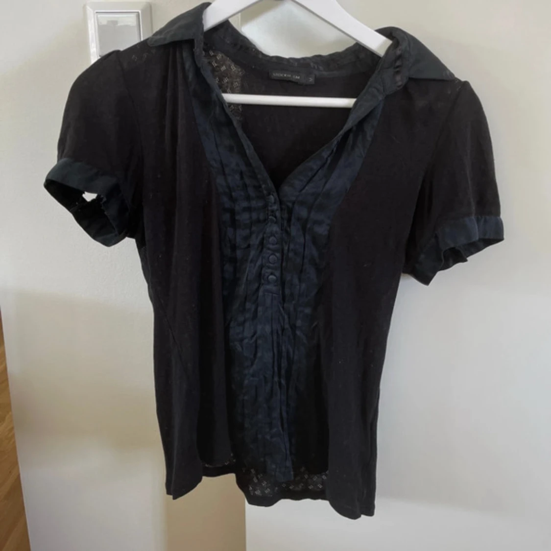 Svart gullig mönstrad blus med knappar. Blusen är i strl M och kommer från ”STOCKHOLM”. Mycket bra skick!