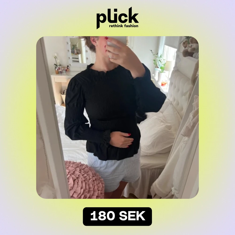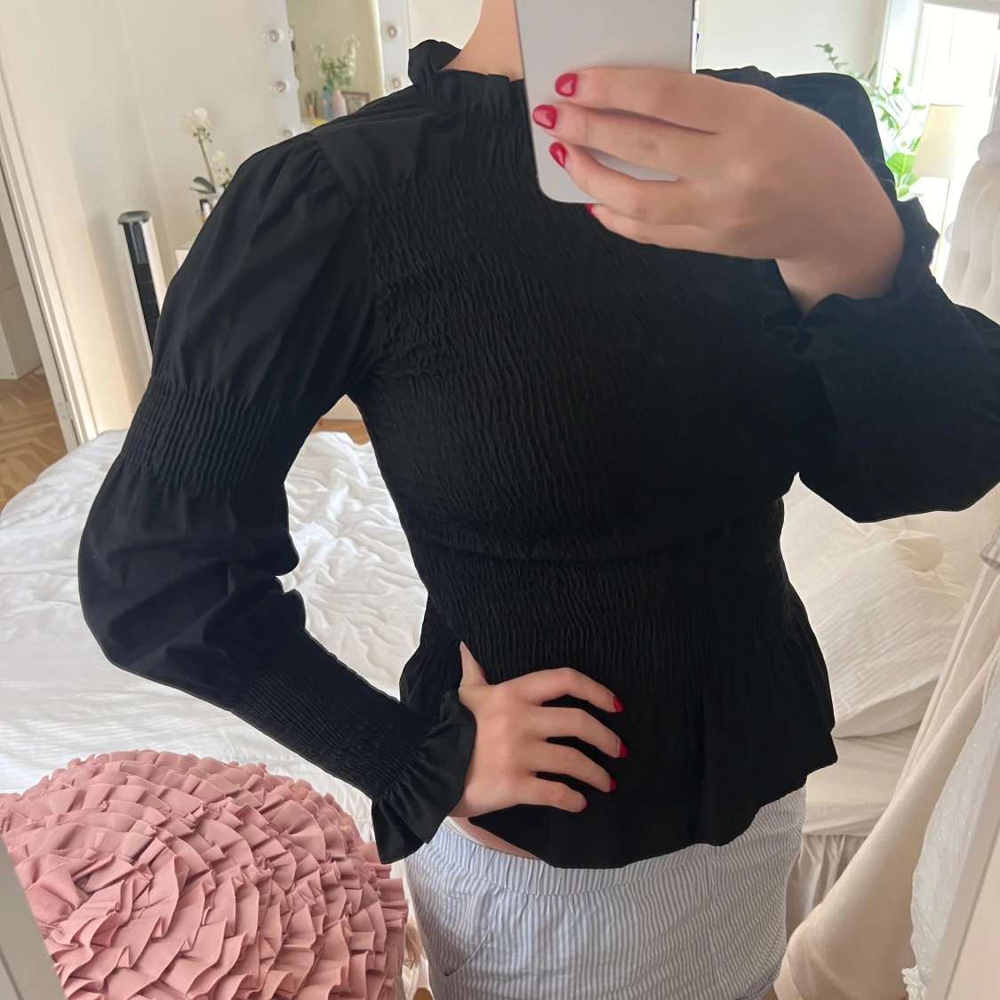 Svart blus med volanger, ballongärm och textur. Från Vero Moda. Sparsamt använd och fint skick. Storlek M men är stretchig så kan passa både mindre och större. 180kr.