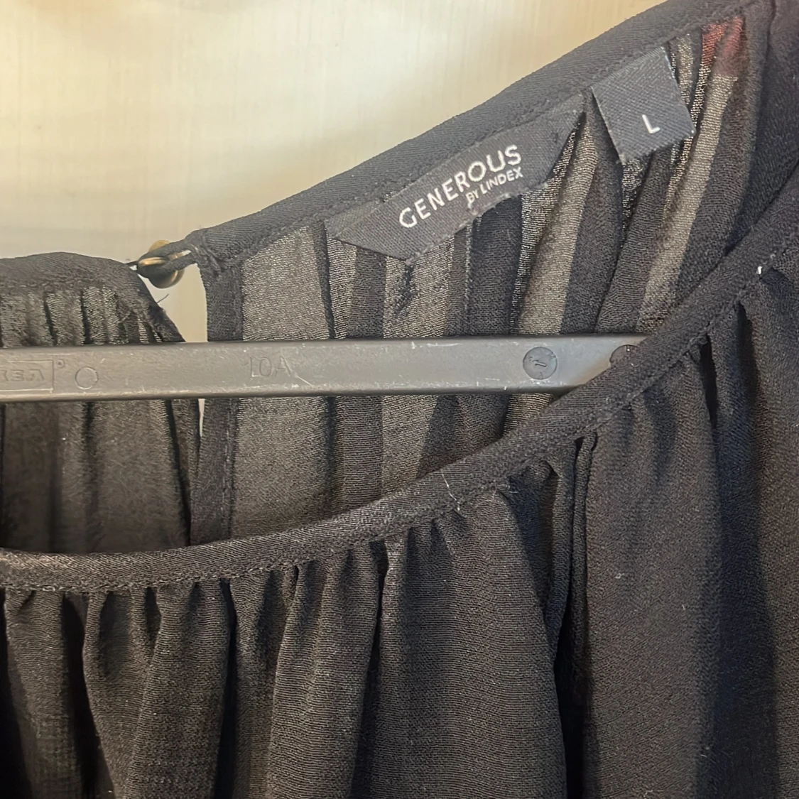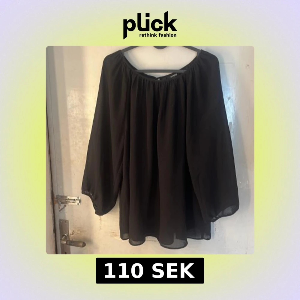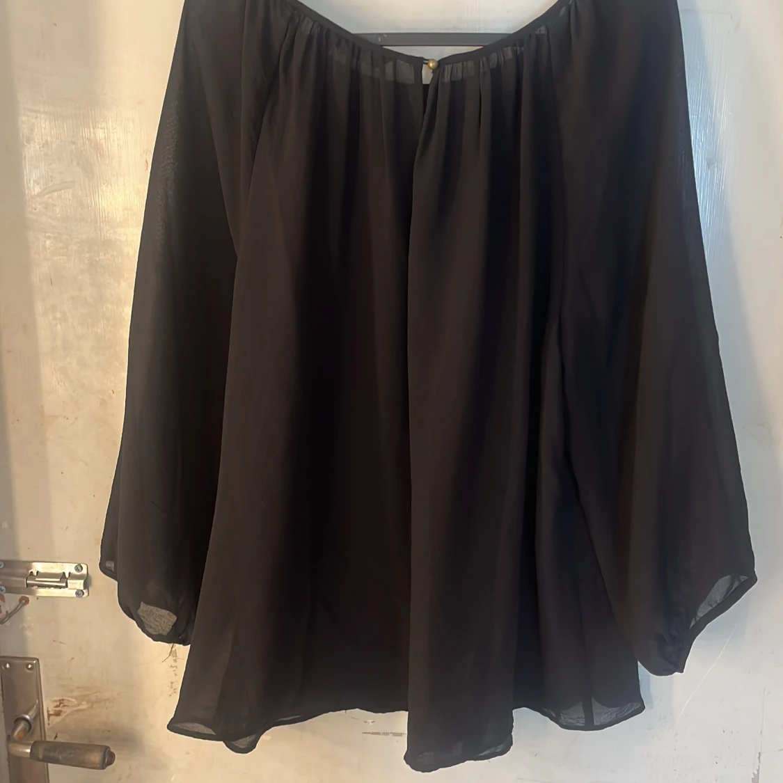 Säljer en svart blus från Lindex i storlek L. Blusen har vida, långa ärmar och en lös passform med rynkad, vid urringning. Tunt, lätt tyg som ger ett flowy intryck. Perfekt för dig som gillar en enkel men stilren look.