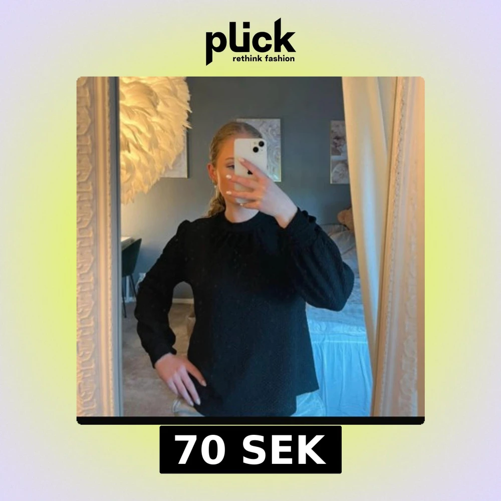 Säljer en svart blus med puffiga långärmar och rund halsringning. Tyget har en lätt struktur som ger en snygg touch. Perfekt för dig som gillar stilrena och enkla plagg med det lilla extra.