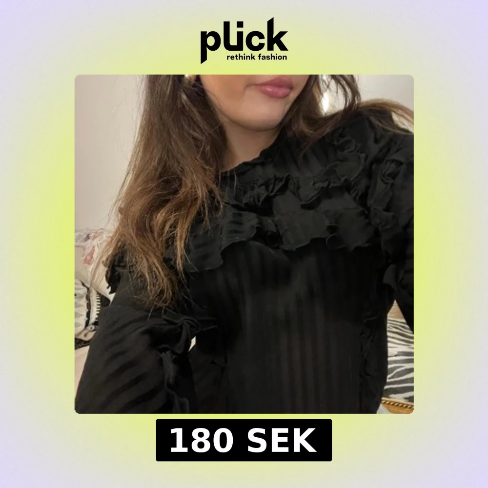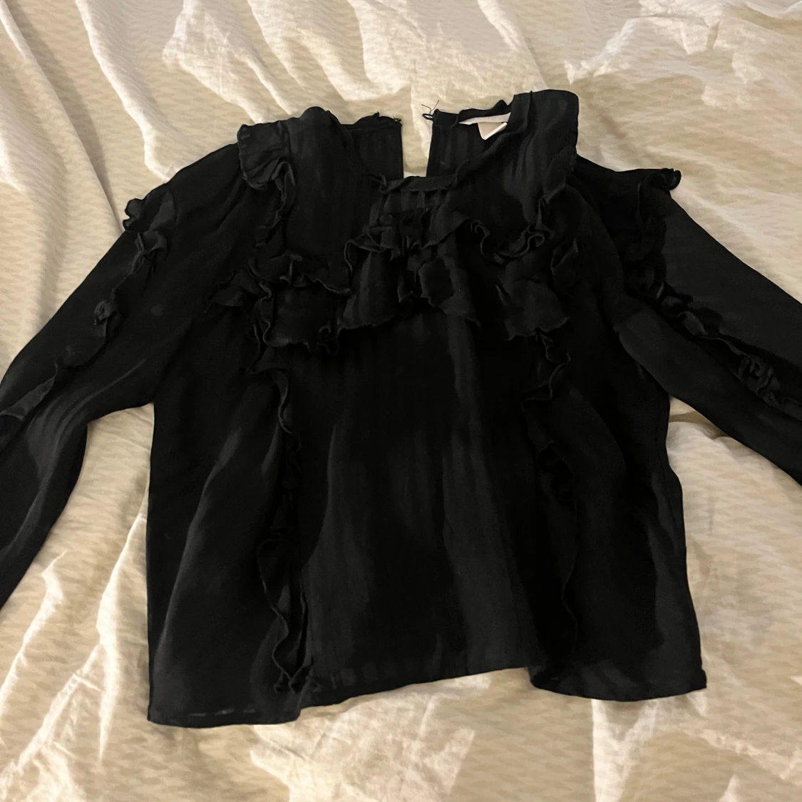 Snygg lite genomskinlig svart blus. Passa perfekt till fest eller vardagen. Väldigt bra material och volanger på. Bra i storleken är kort och har xs-s men storlek 40 passat perfekt med denna tröja om man inte vill ha för tajt.