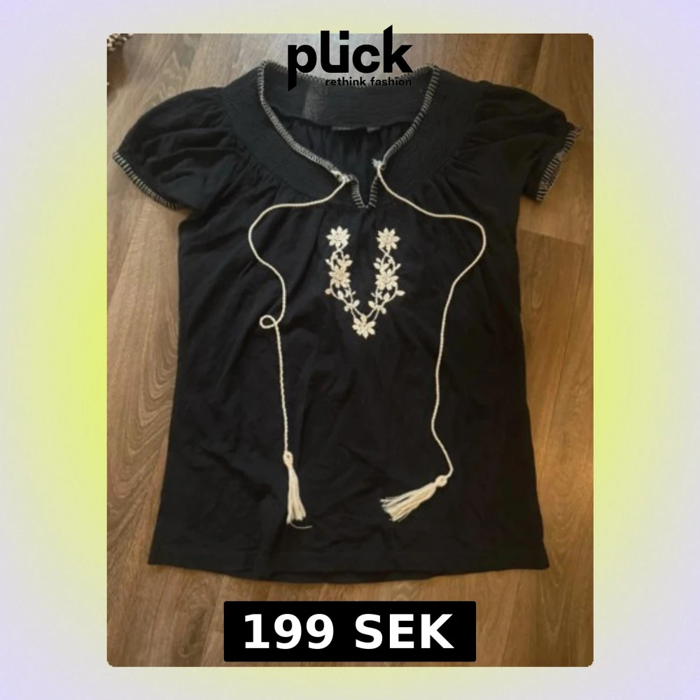 Svart blus från Lindex i storlek XS med krämfärgat blommigt broderi framtill. Blusen har korta puffärmar, bred smockad krage med dekorativa sömmar och knytband med tofsar. Super snygg 💕