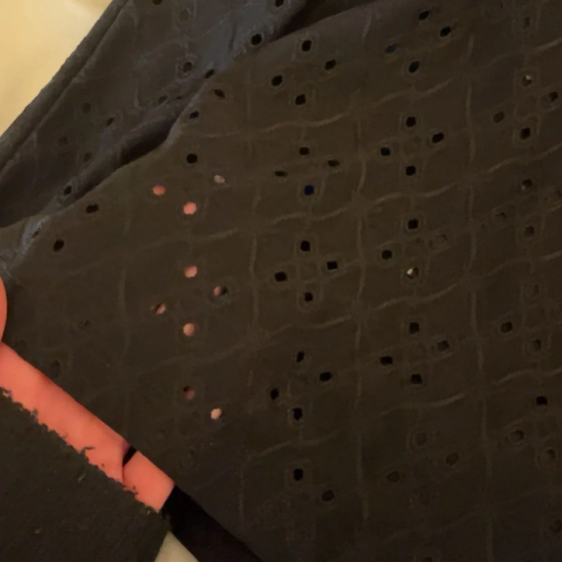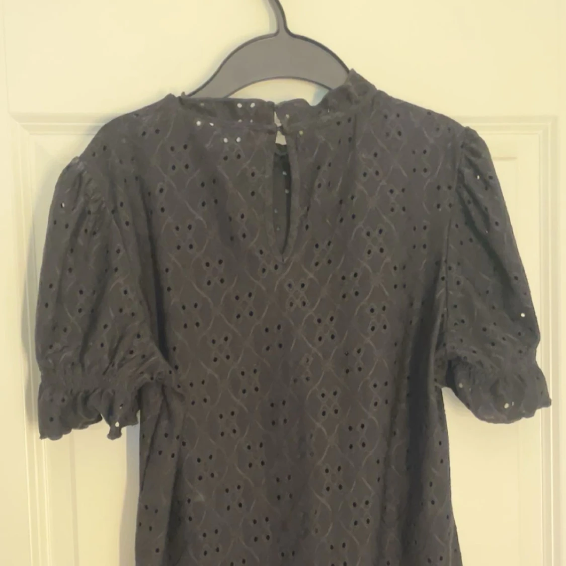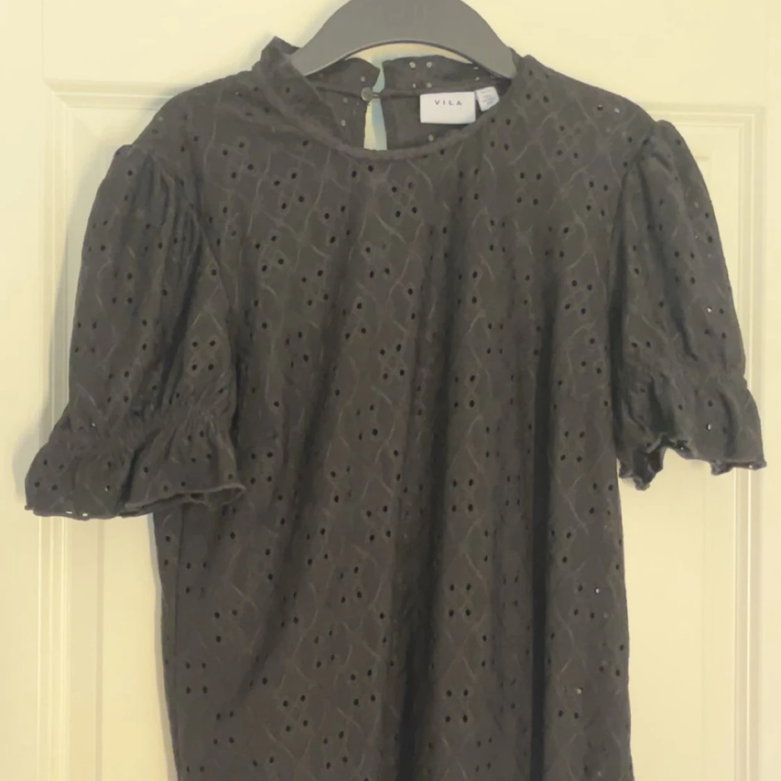 Säljer en svart blus från Vila med broderade hålmönster och puffärmar. Blusen har rund halsringning, korta ärmar med resår och en liten knapp i i nacken!