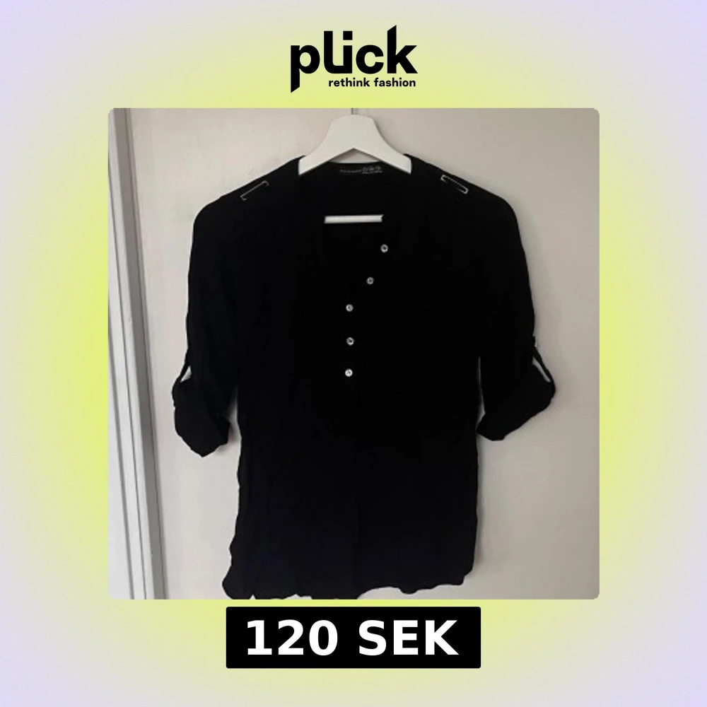 Elegant svart blus med knappar framtill och dekorativa axeldetaljer. Blusen har trekvartsärmar med knappdetalj vid ärmslut. Perfekt för en stilren look.