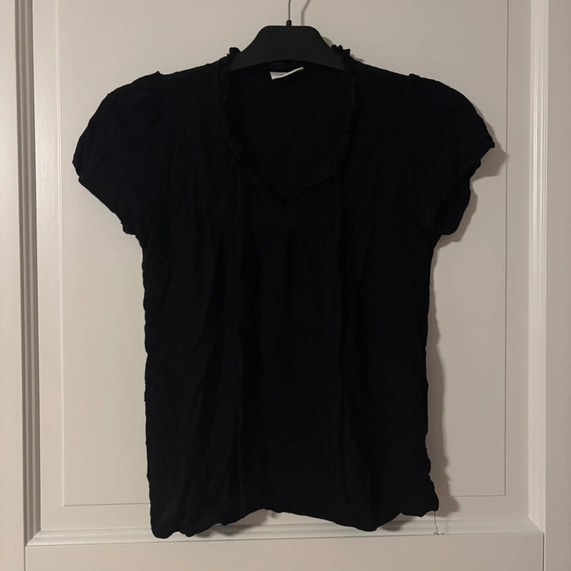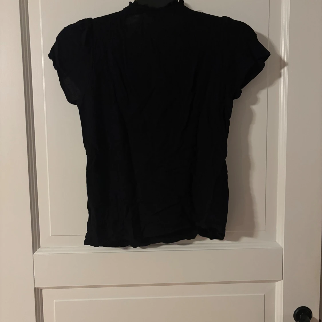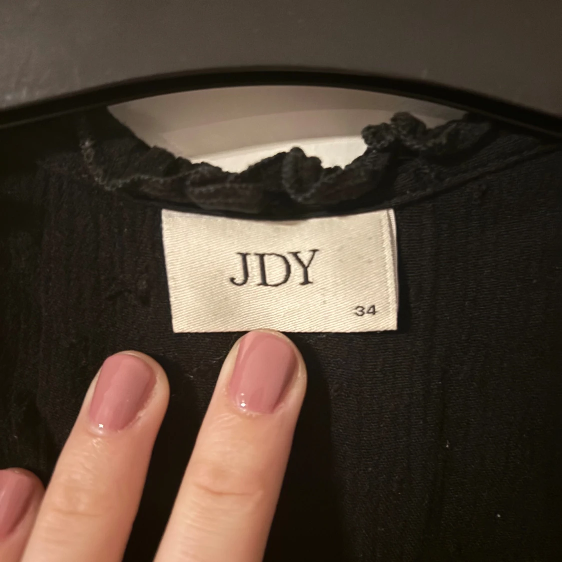 Svart blus från JDY i storlek 34 med korta ärmar, diskret prickigt mönster och volangkantad krage. Blusen har knytband vid halsen och en lös, luftig passform. Perfekt att styla med jeans eller kjol för en trendig look.