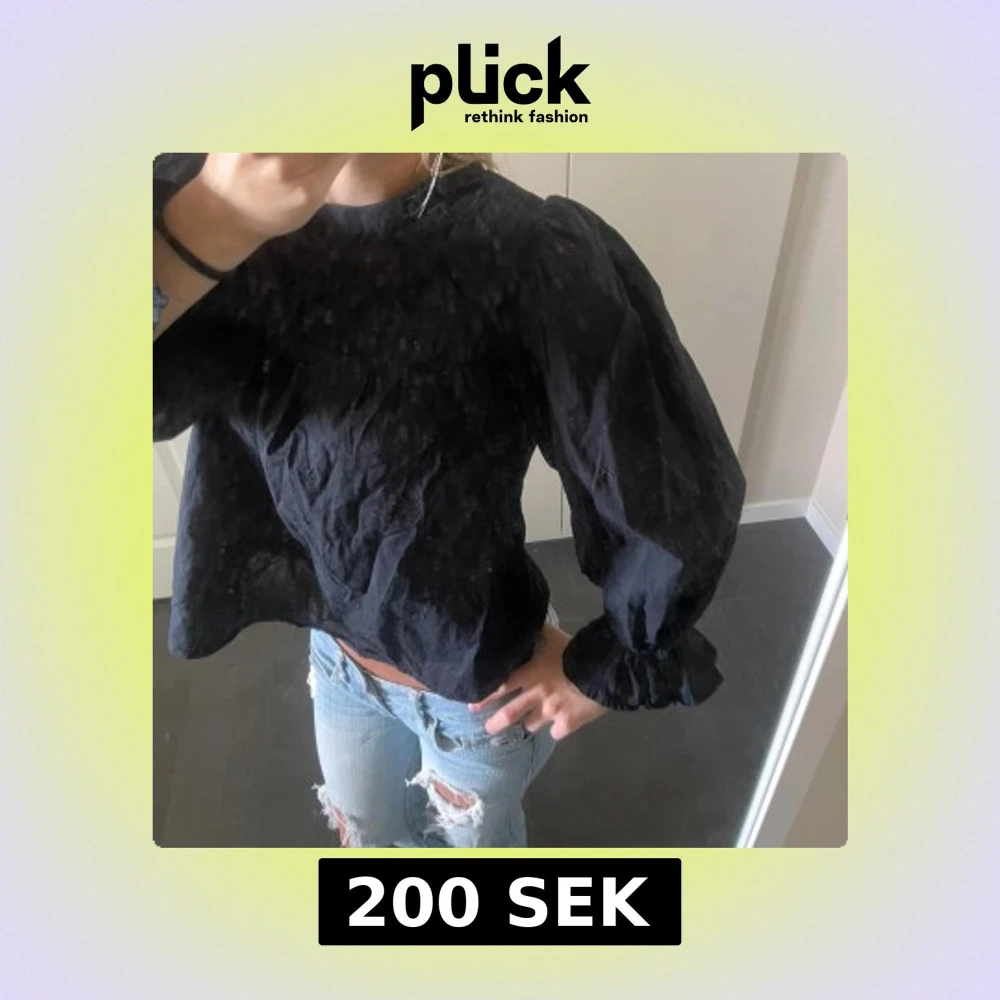 Säljer en svart blus med puffiga ärmar.
