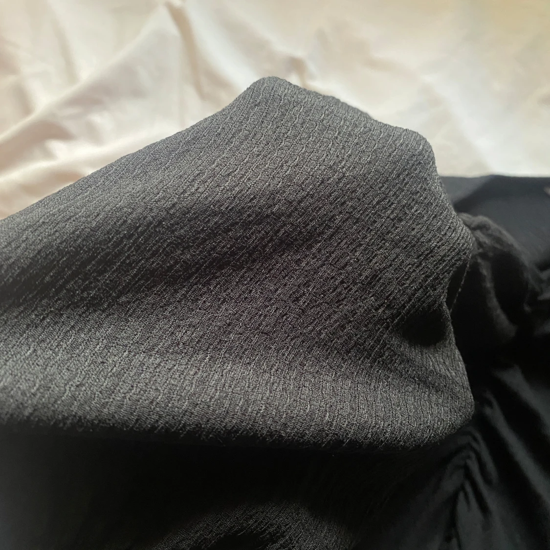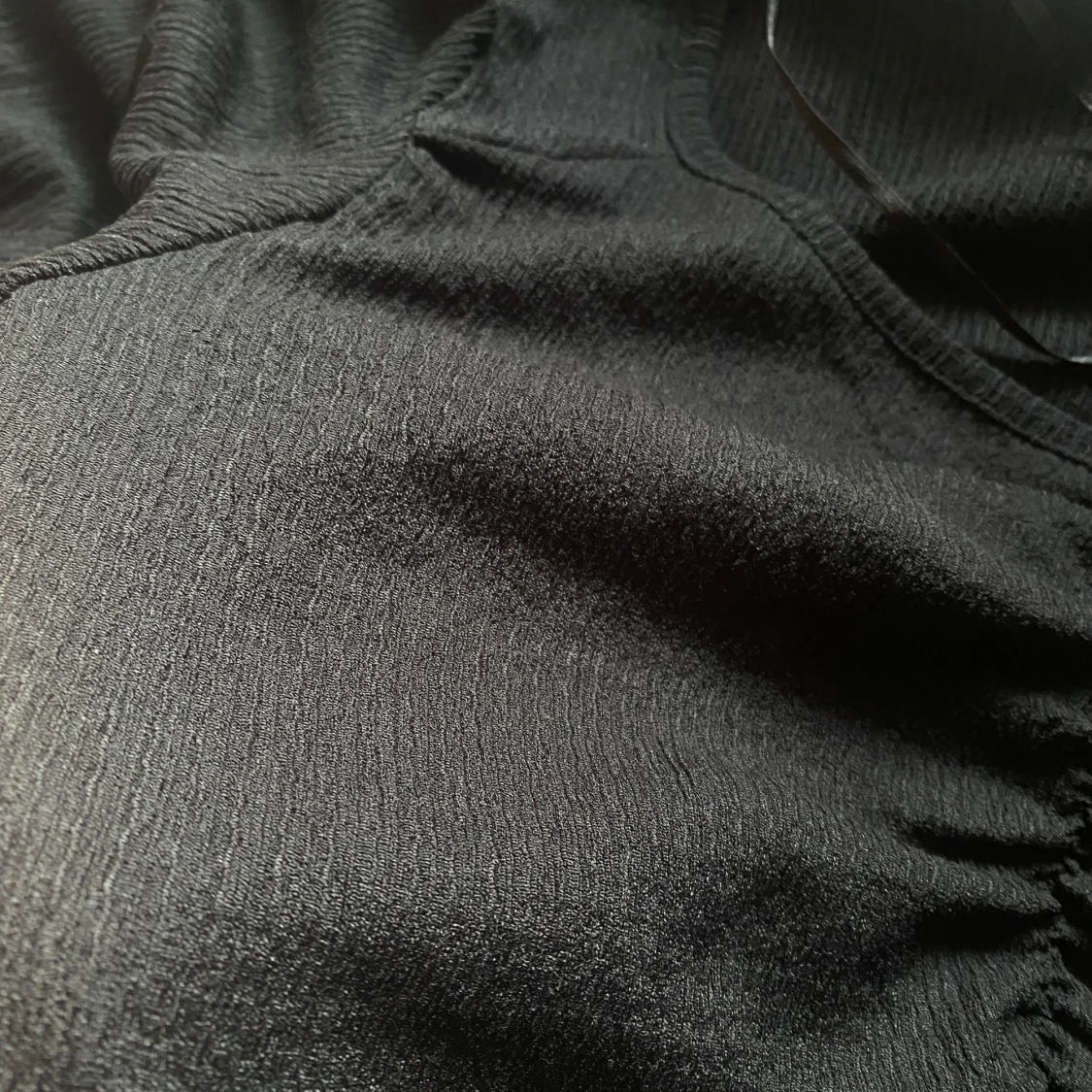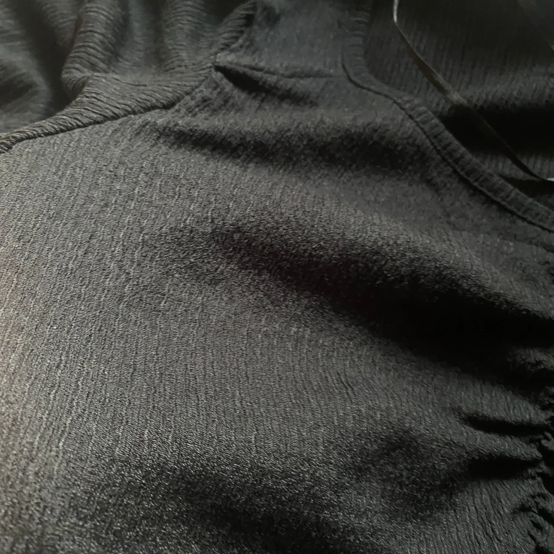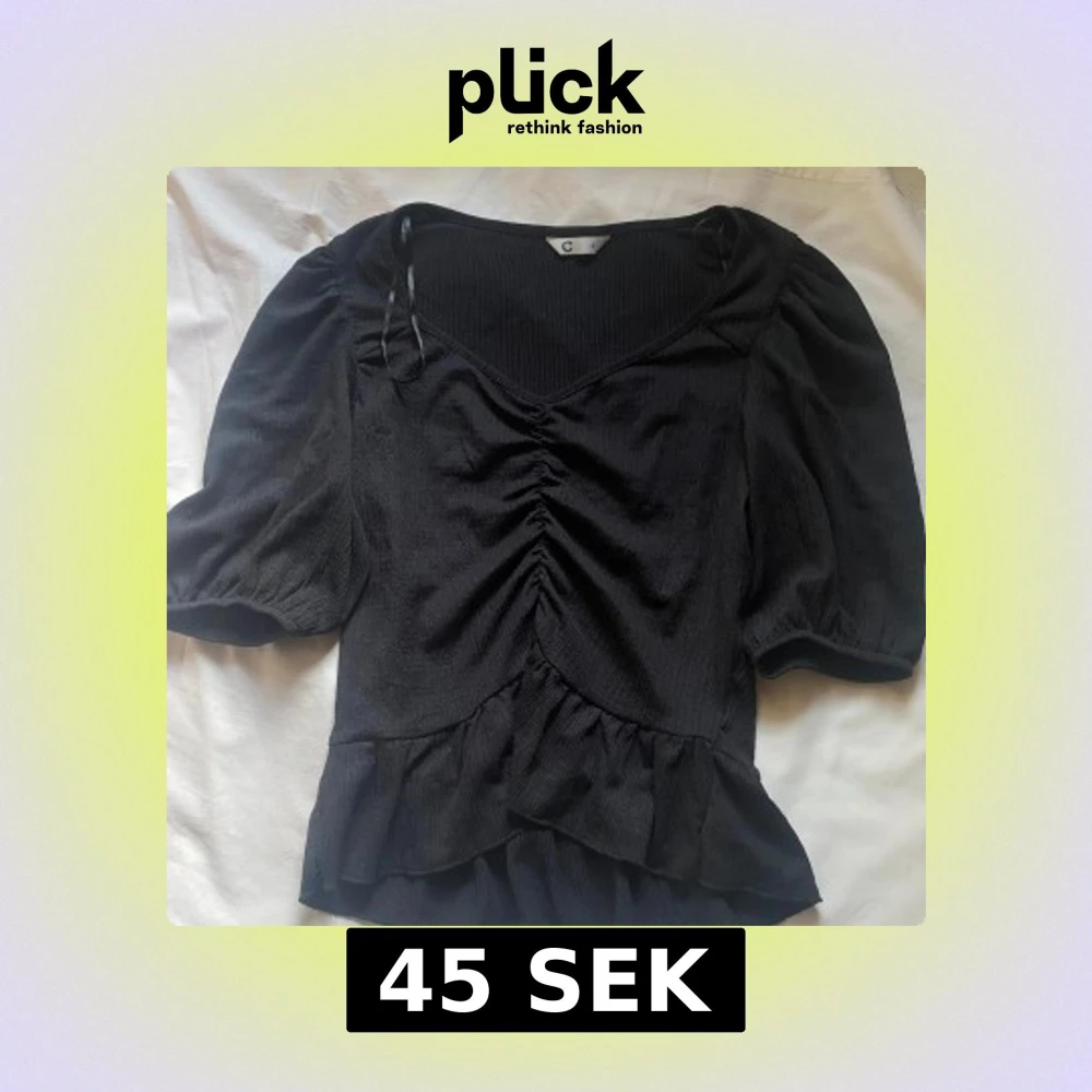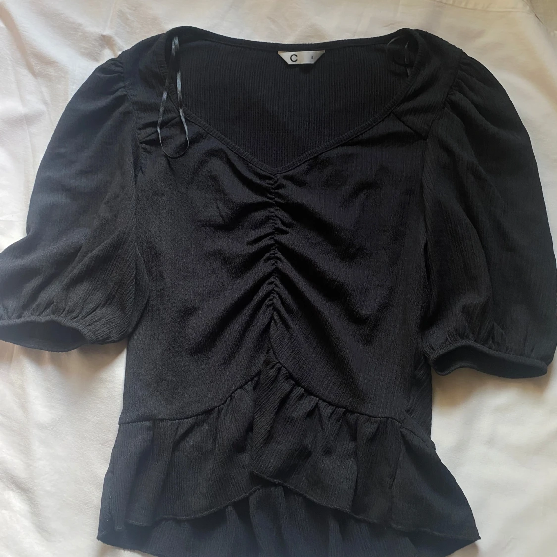 Snygg svart blus med v-ringning och volangdetaljer i nederkant. Toppen har korta puffärmar och en ribbad struktur som ger en elegant look. Perfekt för att klä upp eller ner beroende på tillfälle.