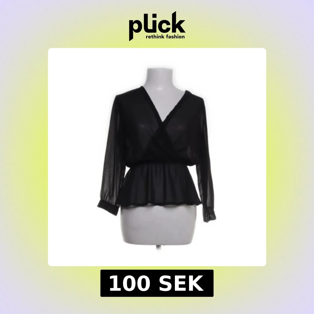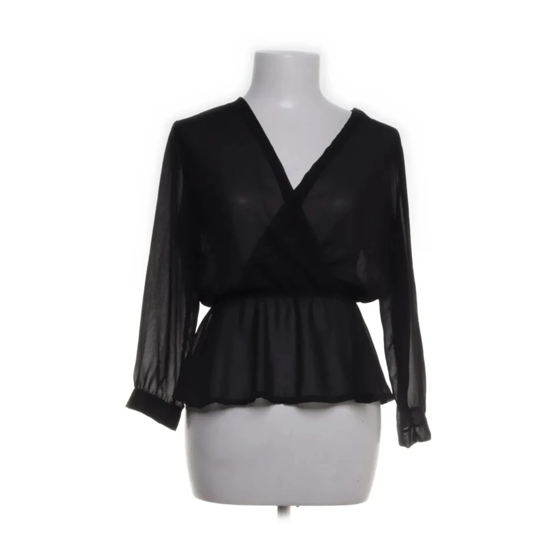 Elegant svart blus med v-ringning och transparenta långa ärmar. Blusen har en omlott-design och en elastisk midja som ger en smickrande passform. Perfekt för en stilren look.