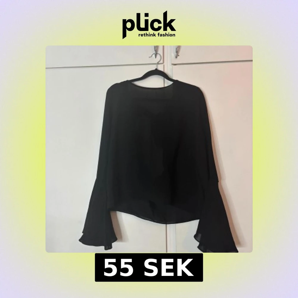 Svart blus från Zara Basic med transparent, lätt tyg och vida trumpetärmar. Baksidan har en snygg öppen detalj med knyt. Använd fåtal gånger så den är som ny. Storlek M.