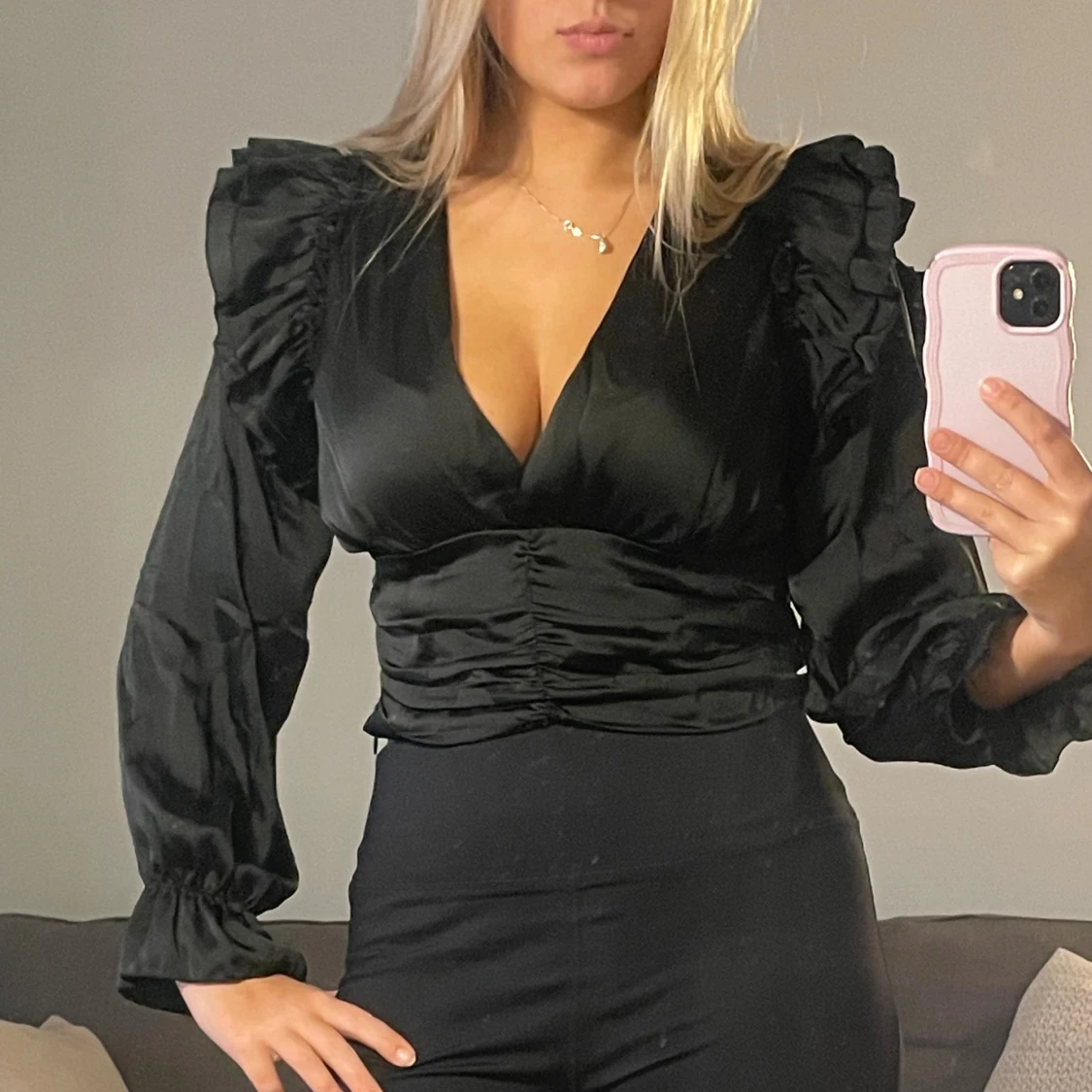 Säljer en svart blus med djup v-ringning och volangdetaljer på axlarna. Använd endast en gång och i väldigt fint skick! 😊
