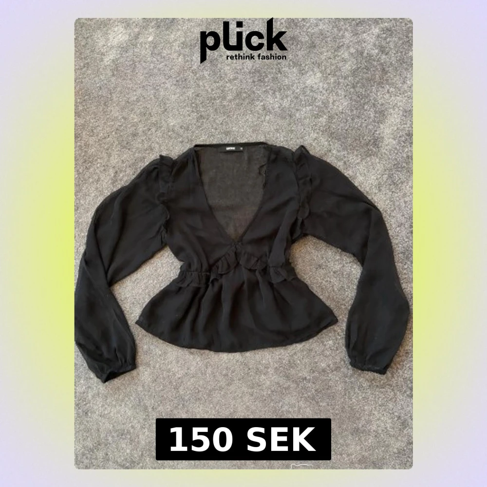 Svart blus från Bik Bok med djup v-ringning och långa ärmar. Blusen har volangdetaljer vid axlar och midja som ger en cool och feminin touch. Perfekt för dig som gillar stilrena och trendiga plagg.