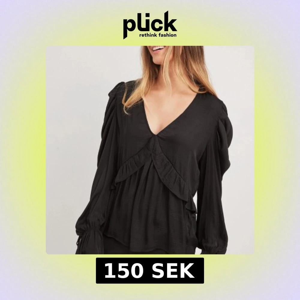 Säljer en svart blus med djup v-ringning och volangdetalj framtill. Blusen har långa ärmar med knyt vid ärmslut. Helt oanvänd och prislappen är kvar.