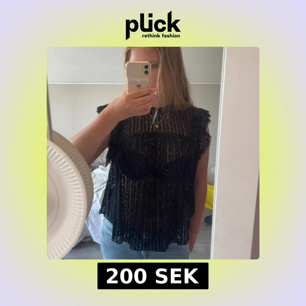 Svart spets blus i från Nelly kommer inte till användning då jag tycker den är lite genomskinlig men det går bra om man har ett svart linne under som då hamnar precis under sömmen. Har använt den 2-3 gånger så den är i nyskick. Blusen går att justera i nacken