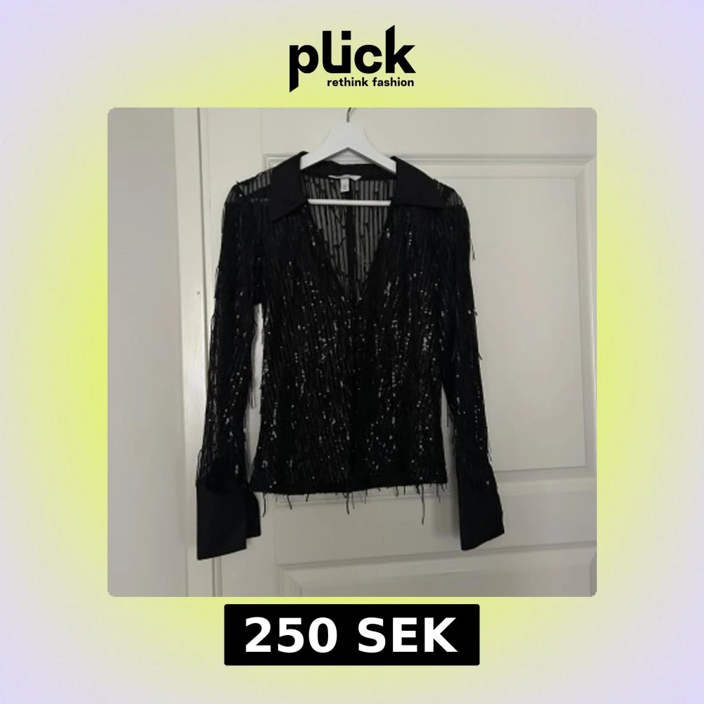 Snygg svart blus med glittriga detaljer och djup v-ringning. Blusen har långa ärmar och en klassisk krage, perfekt för nyår!!!
