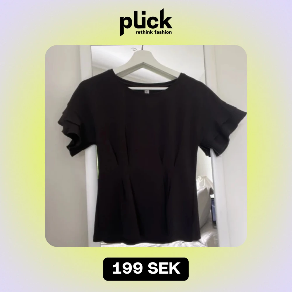 En svart kortärmad blus i fint material med volanger vid ärmarna. Knappt använd.