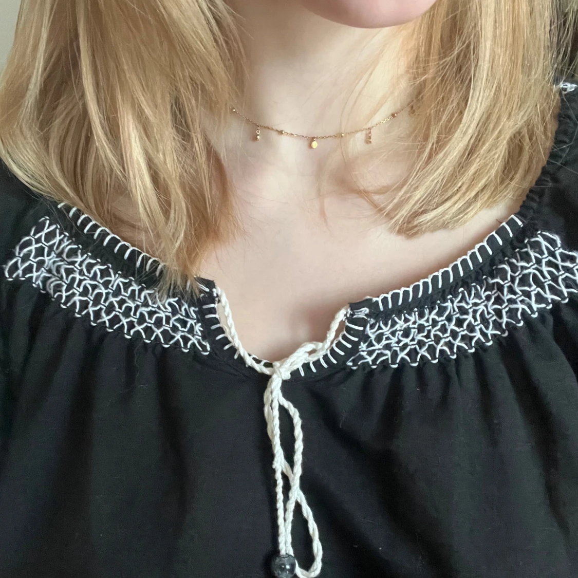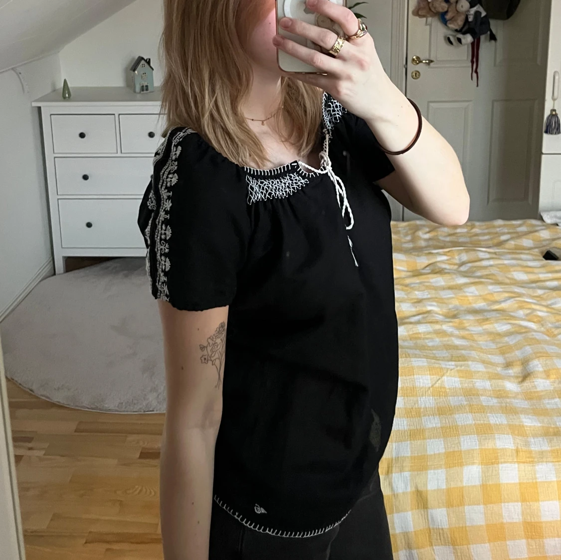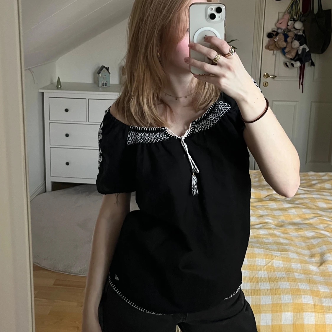 Snygg svart offshoulder blus med vita broderade detaljer runt halsen och ärmarna. Blusen har en knytning framtill som ger en bohemisk känsla. Perfekt för en avslappnad stil.