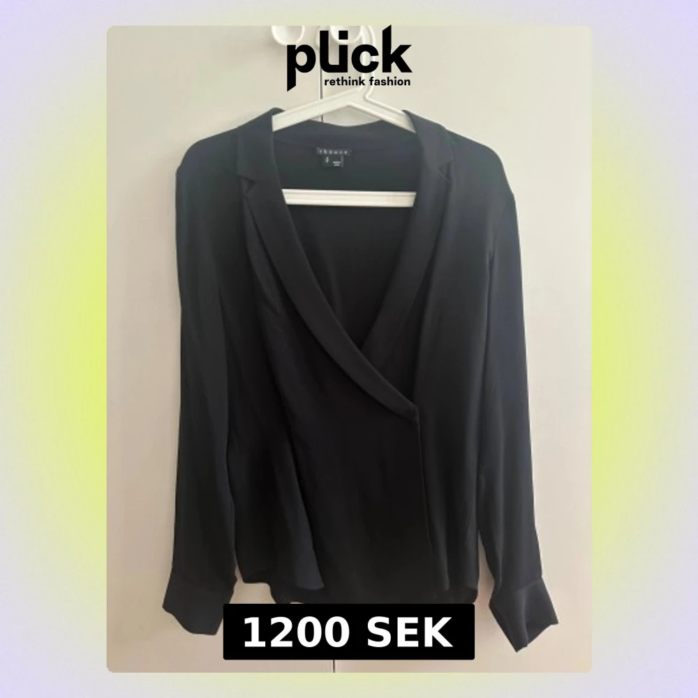 Säljer en stilren svart omlott blus från Theory. Blusen är i 100 silke. Passar perfekt till byxor och kjol