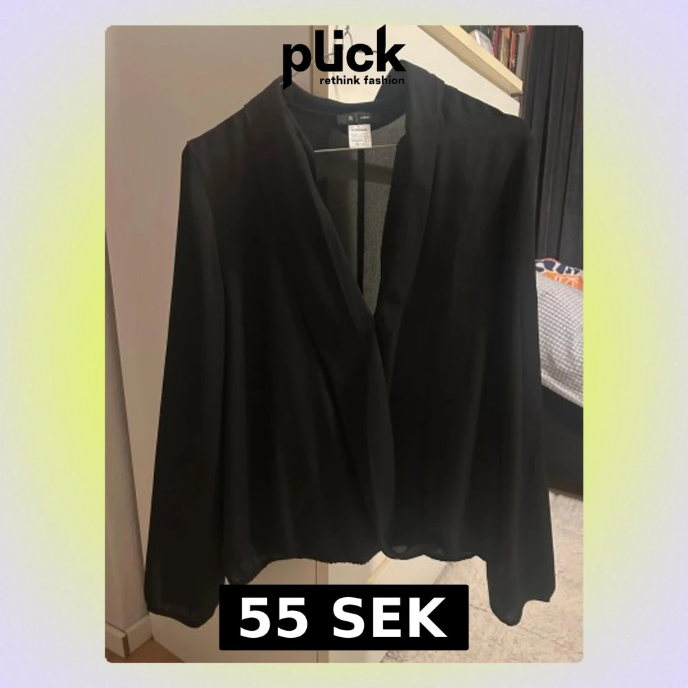 Säljer en svart omlottblus från La Redoute. Blusen har lång ärm, v-ringad omlottfront och är tillverkad i ett lätt, flowy material som ger en snygg siluett. Perfekt för dig som gillar stilrena och enkla plagg med en twist.