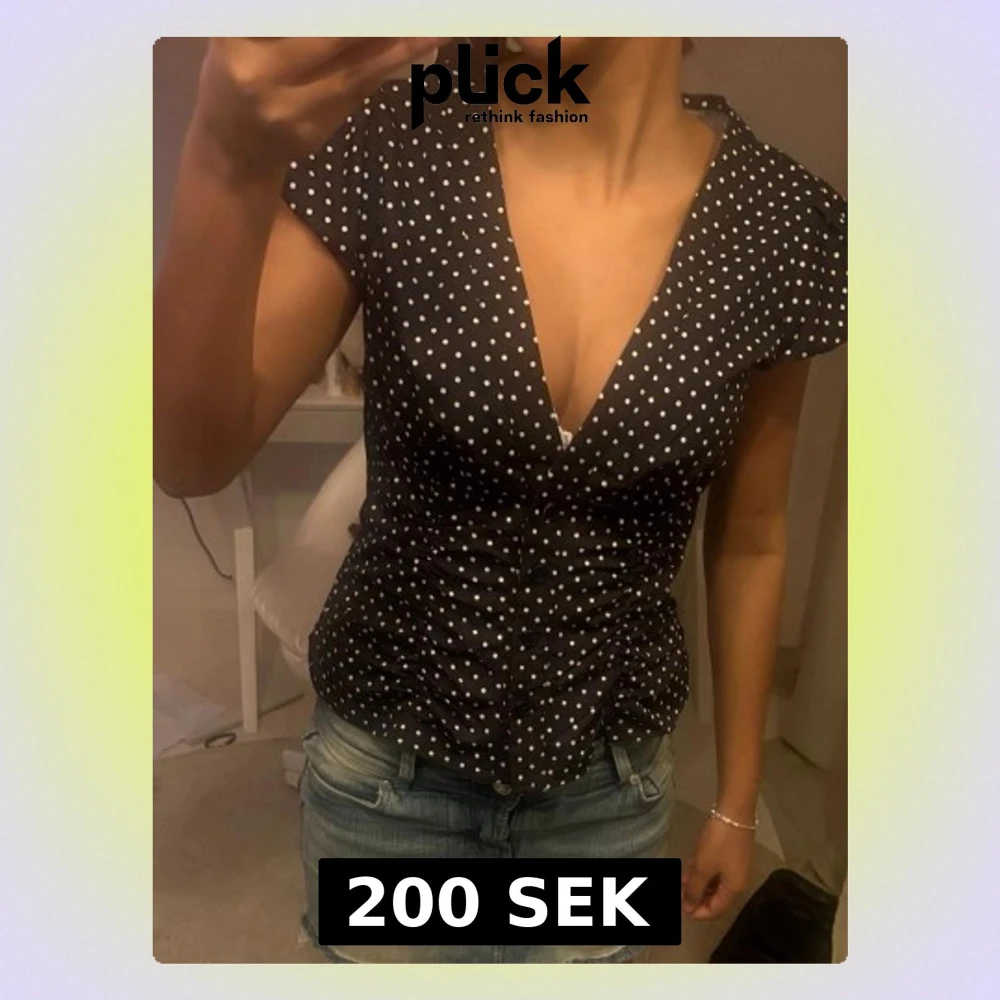 Snygg svart blus med vita prickar och djup v-ringning. Modellen är figurnära med knappar framtill och korta ärmar. Perfekt till jeans eller kjol för en trendig look. Materialet känns lätt och bekvämt.