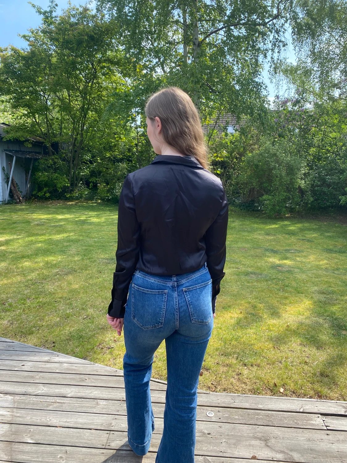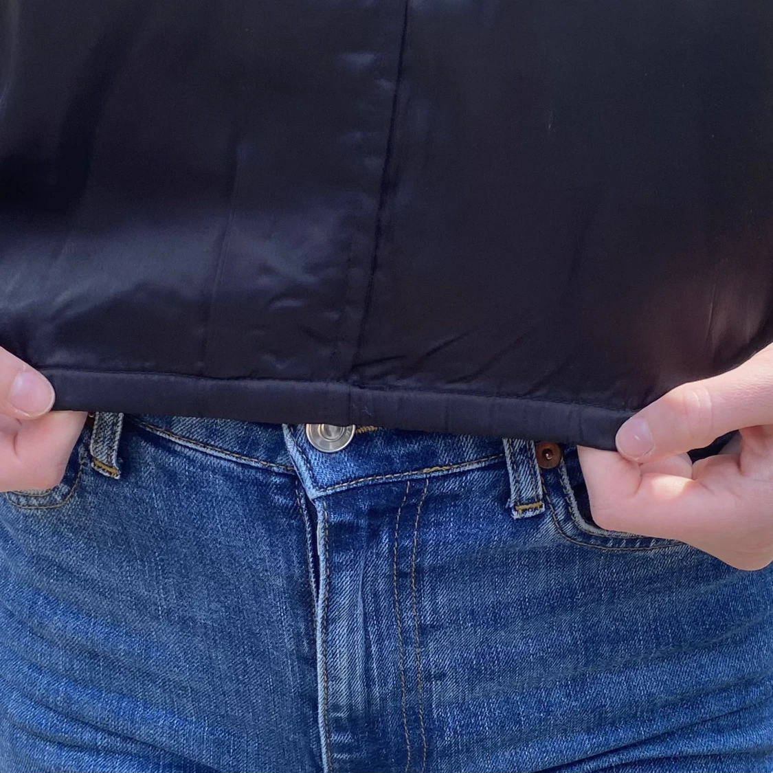 Svart skjort-blus i ett glansigt material med resår nertill (se sista bild), ursprungligen från NAKD, Misslisibells kollektion