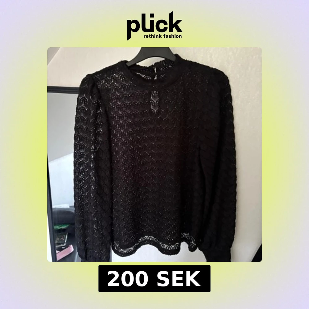 Snygg svart spetsblus med långärmad design och rund hals. Köpt ifrån Nelly för något år sedan och bara använd 1 gång sen dess. Blusen har en knappdetalj i nacken.