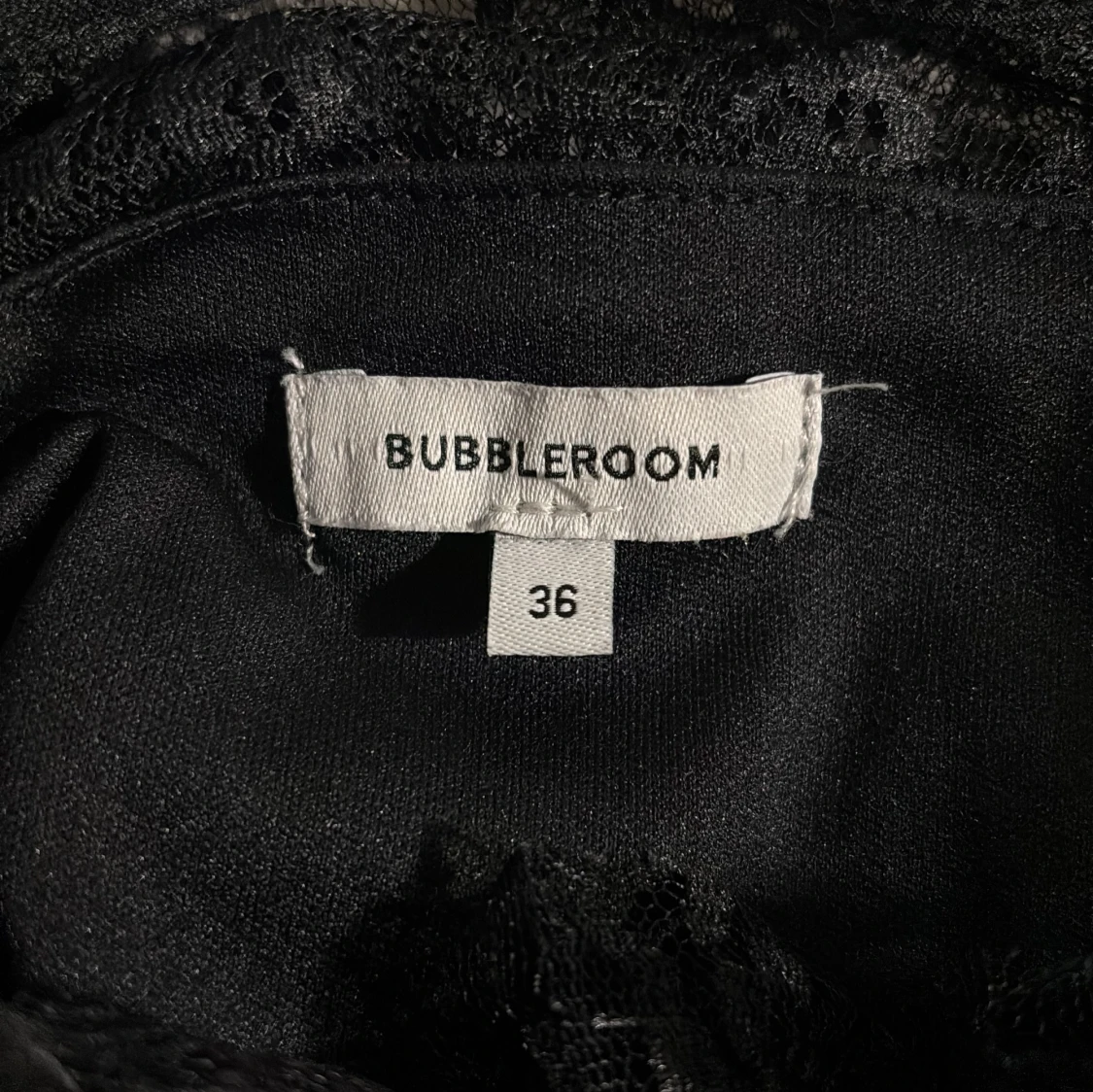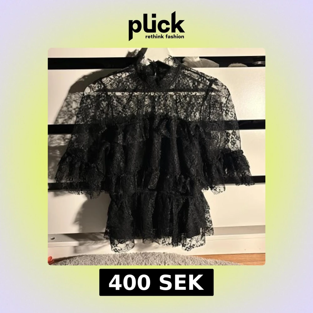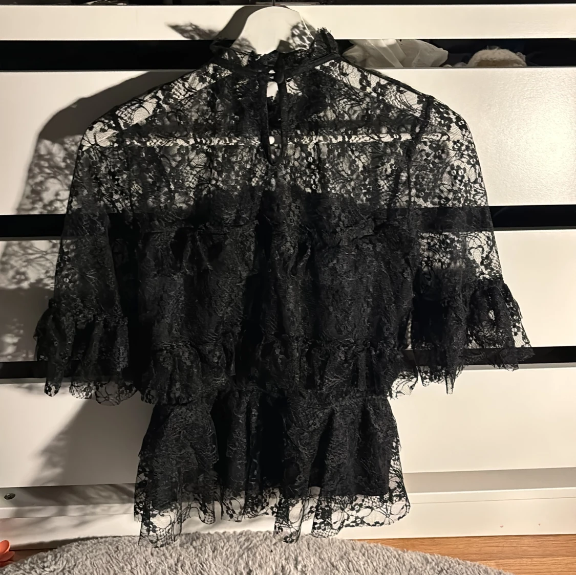 Säljer en svart blus från Bubbleroom i storlek 36. Blusen är gjord i transparent spets med flera lager volanger och har en hög hals samt korta ärmar med volangkant. Andvänt 2 gånger