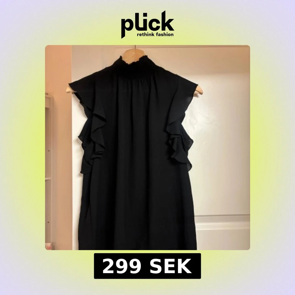 Svart blus från Gina Tricot med hög smockad krage och volangdetaljer längs ärmhålen. Knappt använd där av priset.