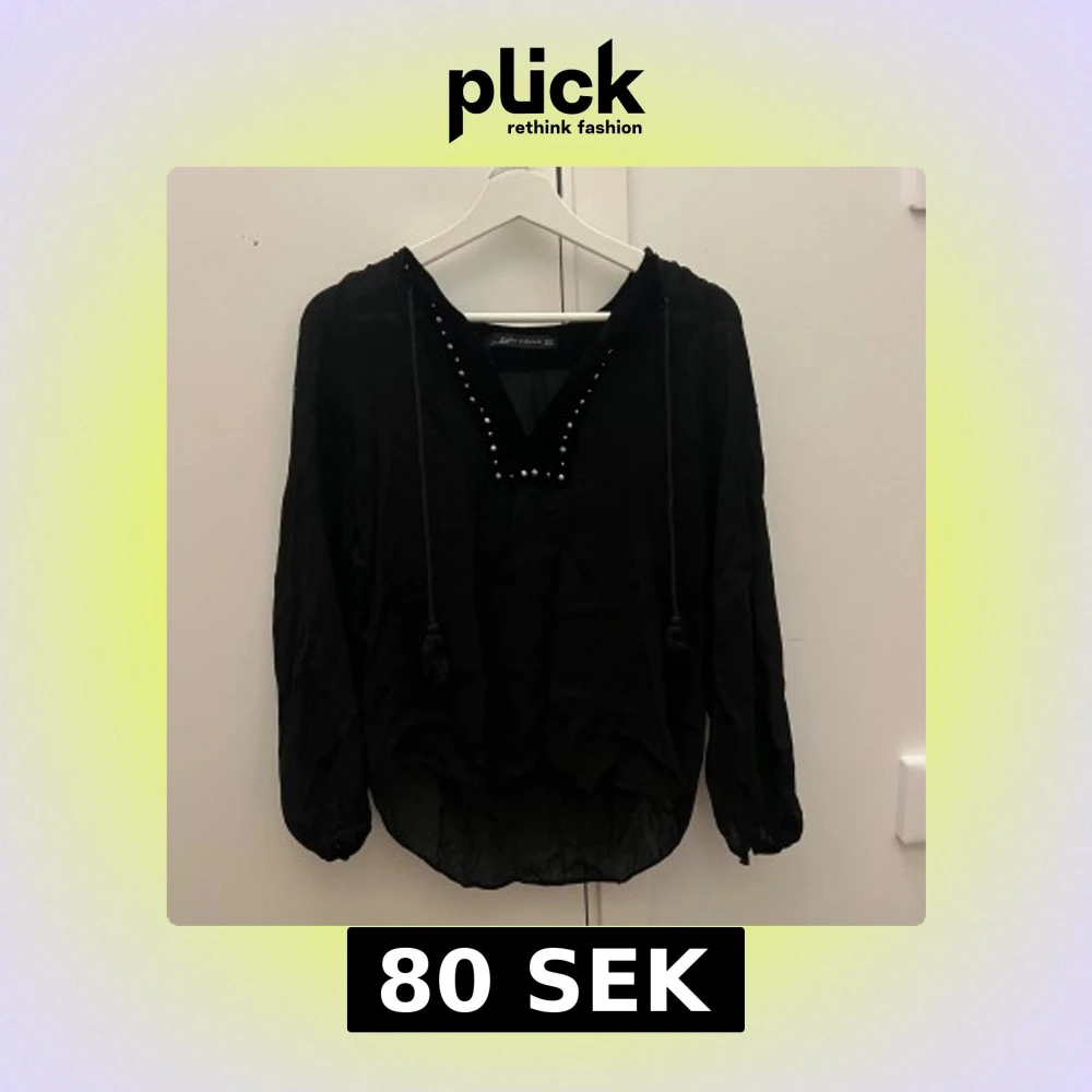 Säljer denna superfina svarta blusen från Zara och som har velour detaljer, knyte och ”nitar” ❤️ om man inte gillar snöret kan man klippa av det!