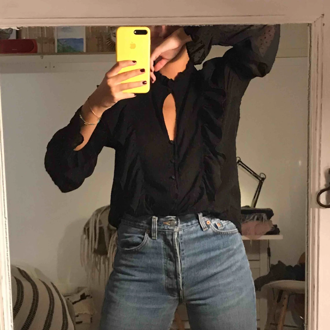Oanvänd svart blus med volanger och knapp i halsen. Köpt på bikbok. Frakt tillkommer