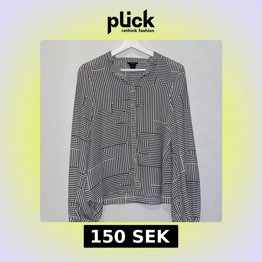 Säljer en svartvit blus från Lindex med mönster. Blusen har långa vida ärmar och knäppning framtill.