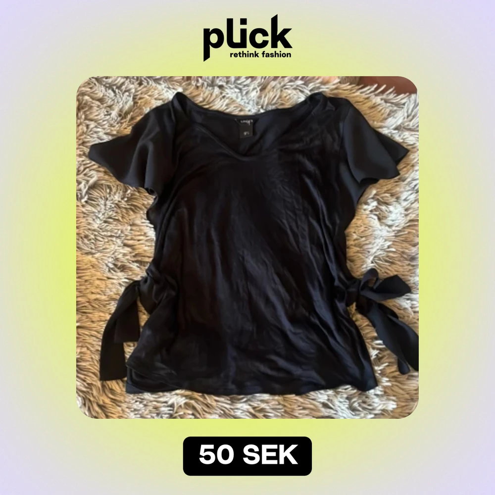 Mörk blå t-shirt med volanger på axlarna och knuta rosetter på sidan