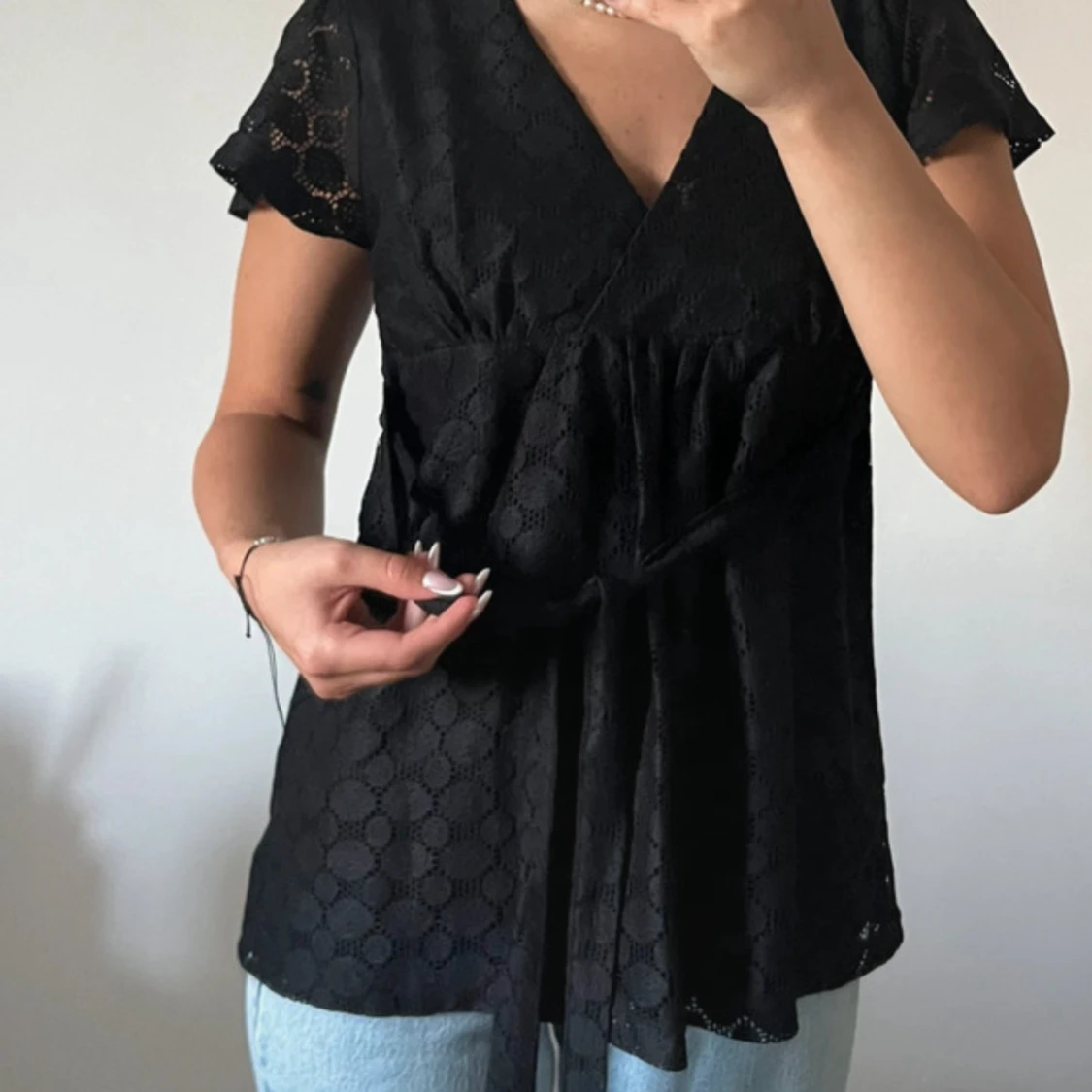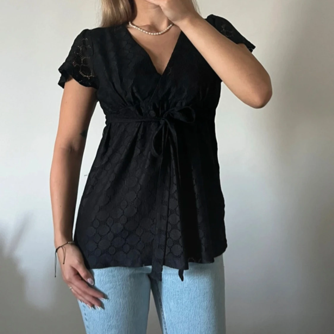 Fin skjorta med snöre som man kan knyta fast skjortan med. Storleken är S men skulle säga att passar allt från XS-M😊