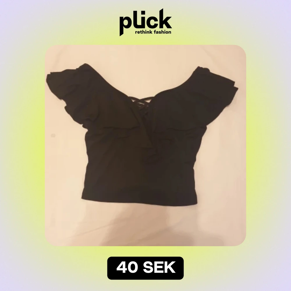 Svart topp med spetsdetaljer i ryggen och volanger på axlarna. Toppen är kort och har en avslappnad passform. Säljer för 40