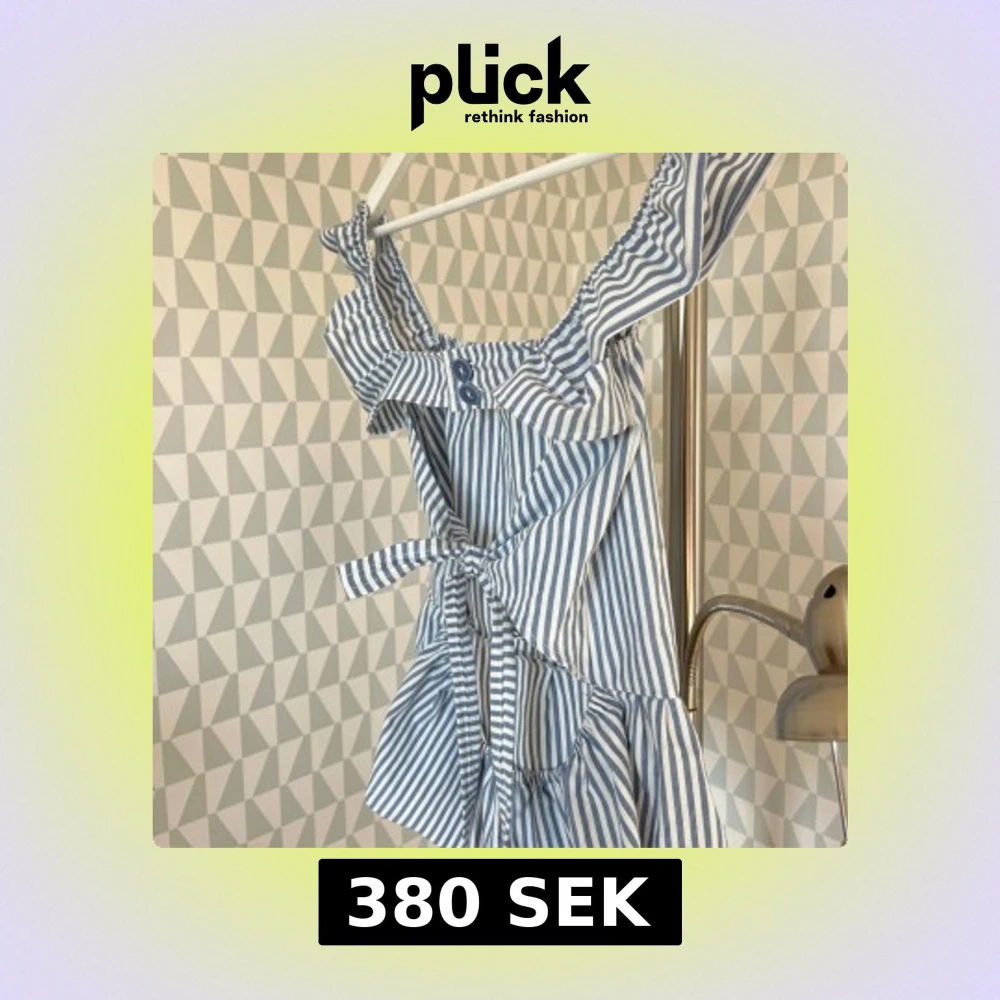 ljusblå randig somrig topp. knytning i ryggen och knappar ovanför:). Skulle säga att strl är XS/S. Möjligen M beroende på byst :) Har sytt den själv💞