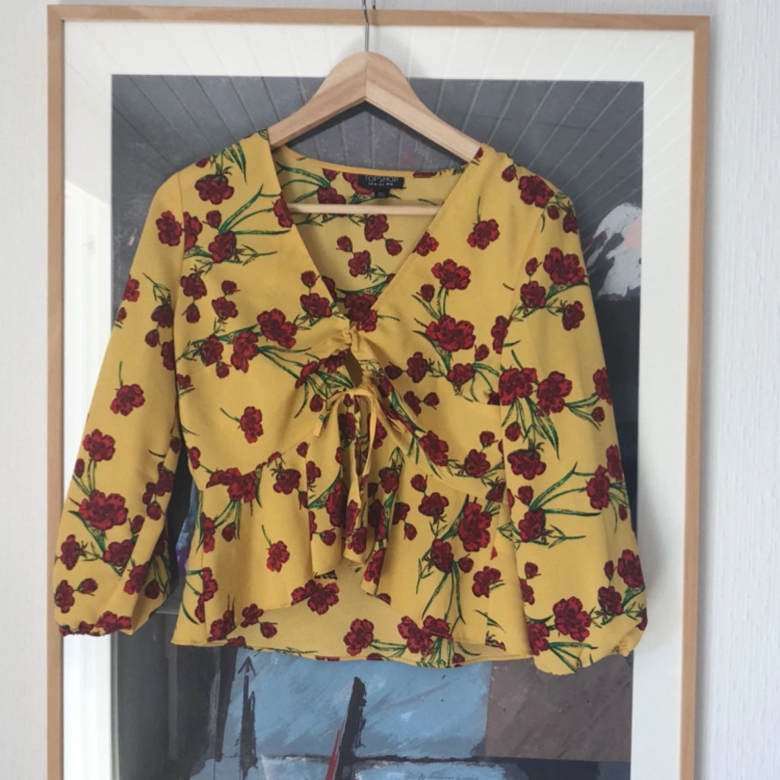 Söt blus som blir perfekt i sommar! Färgen är rättvist visad på andra bilden. Knäpps med en knapp och knyts framtill. Möts ej upp, skickar endast, men frakten ingår i priset!