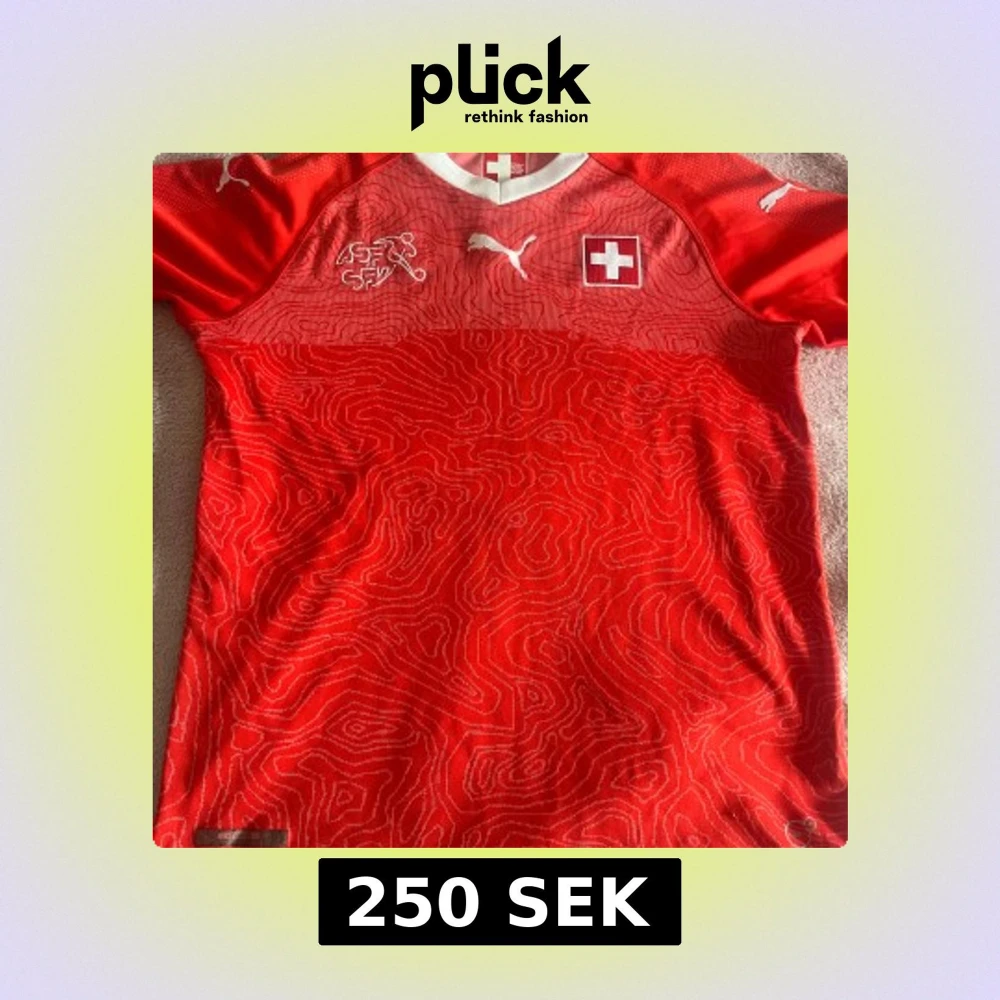 Schweiz landslagströja från Puma i starkt röd färg med vita detaljer och Schweiz-emblem på bröstet. Tröjan har korta ärmar och ett unikt mönster som liknar topografiska linjer över hela framsidan. Materialet är lätt och andas, perfekt för match eller träning. Köpt i Schweiz 🇨🇭