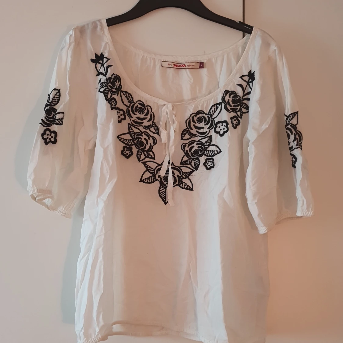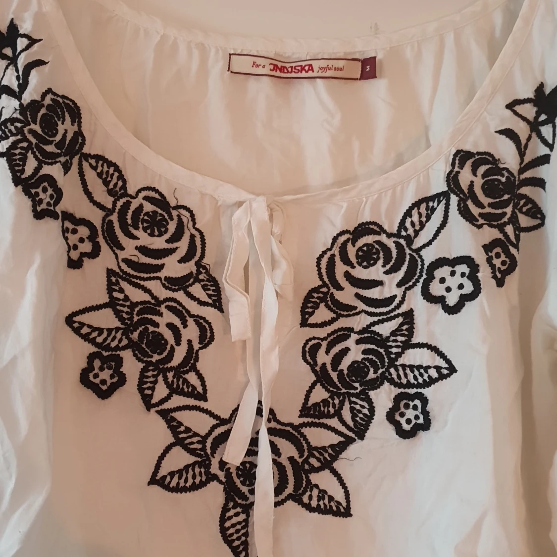Söt blus storlek Medium från indiska Använd ett fåtal ggr inget som syns så skriver använt mycket gott skick vit med svart brodyr trekvartsärm pris 160kr