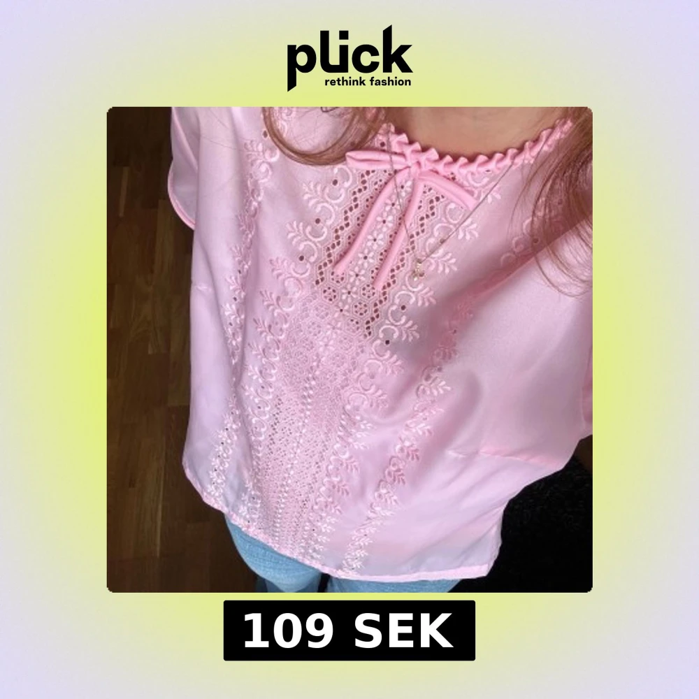 Supersöt ljusrosa blus i satinliknande material med broderade detaljer framtill, liten rosett vid halsen och knappar i ryggen. Blusen har korta ärmar.
