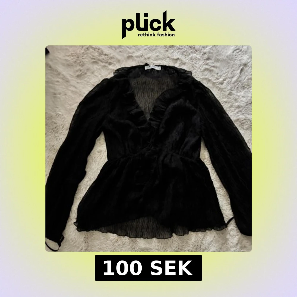Säljer en svart blus från NA-KD i storlek 34. Blusen har långa ärmar, v-ringning och fina volangdetaljer längs halsringningen och framtill. Tunt, lätt material som ger en elegant känsla.💕