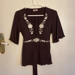 Säljer denna superfina bruna blusen med vita blommor och detaljer! Den har en knytning både fram och bak! Bra skick, står storlek XS men passar även större storlekar! DM vid frågor osv! 🤎 (säljer även en likadan i vitt!)