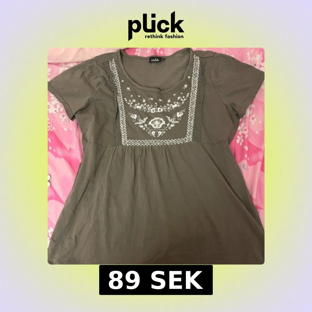 Säljer en olivgrön blus från isolde med vackert vitt broderi framtill. Blusen har korta ärmar.