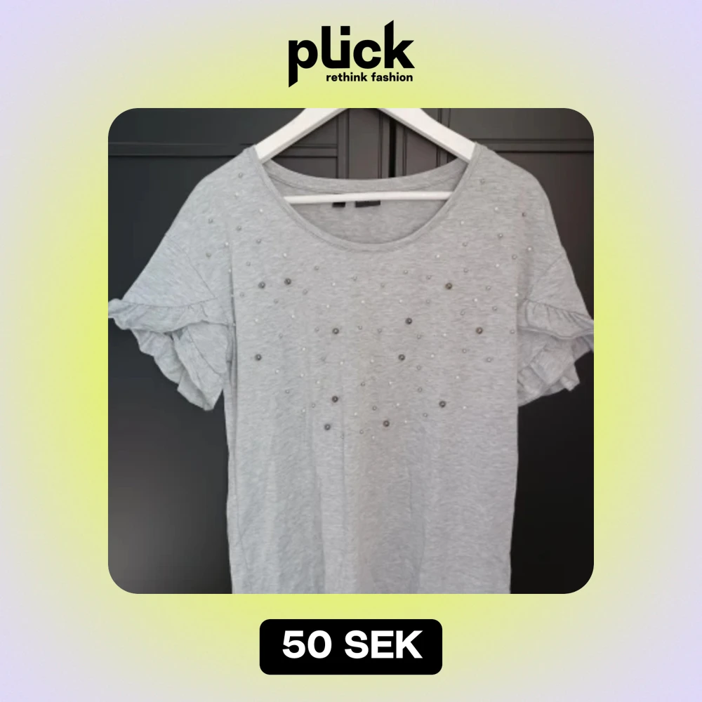 En grå tröja med pärlor och volanger på ärmarna. Fint skick o skönt material.
